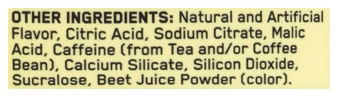 Ingredients: Electrolyte Blend: Sodium Citrate, Magnesium Oxide, Potassium Chloride. Other Ingredients: Natural and Artificial Flavor, Citric Acid, Sodium Citrate, Malic Acid, Caffeine (from Tea and/or Coffee Bean), Calcium Silicate, Silicon Dioxide, Sucralose, Beet Juice Powder (Color)