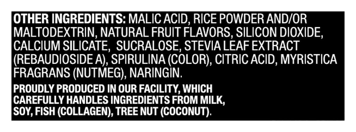 Ingredients: Other Ingredients: Malic Acid, Rice Powder and/or Maltodextrin, Natural Fruit Flavors, Silicon Dioxide, Calcium Silicate, Sucralose, Stevia Leaf Extract (Rebaudioside A), Spirulina (Color), Citric Acid, Myristica Fragrans (Nutmeg), Naringin Contains: Milk, Soybeans, Fish, Tree Nuts, Coconuts