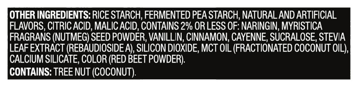 Ingredients: Performance & Pump Blend: L-Citrulline (Vegan, Fermented), Beta-Alanine, Taurine, L-Tyrosine. Other Ingredients: Rice Starch, Fermented Pea Starch, Natural and Artificial Flavors, Citric Acid, Malic Acid, Contains 2% or Less of: Naringin, Myristica Fragrans (Nutmeg) Seed Powder, Vanillin, Cinnamon, Cayenne, Sucralose, Stevia Leaf Extract (Rebaudioside A), Silicon Dioxide, MCT Oil (Fractionated Coconut Oil), Calcium Silicate, Color (Red Beet Powder) Contains: Tree Nuts, Coconuts, Milk, Soybeans, Fish