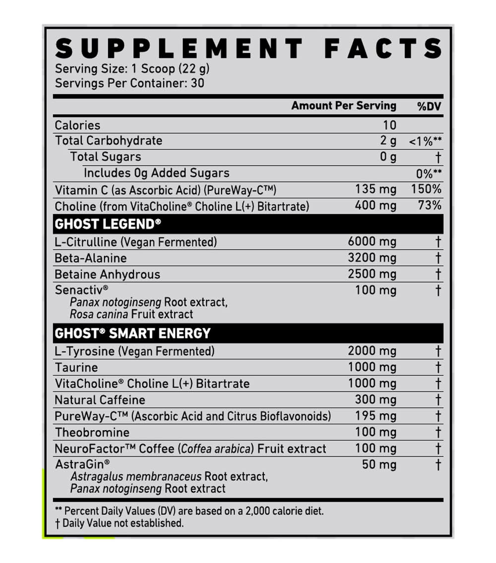 Ingredients: Ghost Legend: L-Citrulline (Vegan Fermented), Beta-Alanine, Betaine Anhydrous, Senactiv Panax Notoginseng Root Extract, Rosa Canina Fruit Extract, Ghost Smart Energy: L-Tyrosine (Vegan Fermented), Taurine, Vitacholine Cholie L(+) Bitartrate, Natural Caffiene, Pureway-C (Ascorbic Acid and Citrus Bioflavonoids), Theobromine, Neurofactor Coffee (Coffea Arabica) Fruit Extract, Astragin Astragalus Membranaceus Root Extract, Panax Notoginseng Root Extract. Other Ingredients: Natural and Artificial Flavor, Citric Acid, Malic Acid, Silicon Dioxide, Calcium Silicate, Gum Acacia, Tartaric Acid, Sucralose, Beet Root Powder (for Color), Vegetable Juice Powder (for Color)