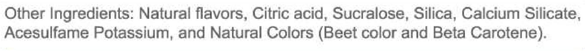 Ingredients: Other Ingredients: Natural Flavors, Citric Acid, Sucralose, Silica, Calcium Silicate, Acesulfame Potassium, and Natural Colors (Beet Color and Beta Carotene)