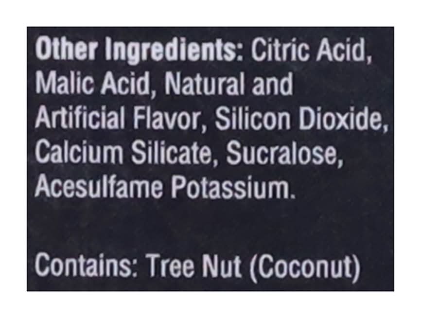Ingredients: Other Ingredients: Citric Acid, Malic Acid, Natural and Artificial Flavor, Silicon Dioxide, Calcium Silicate, Sucralose, Acesulfame Potassium Contains: Tree Nuts, Coconuts, Eggs, Wheat, Fish, Crustacean Shellfish, Molluscan Shellfish, Peanuts, Tree Nuts, Soybeans, Milk, Sesame