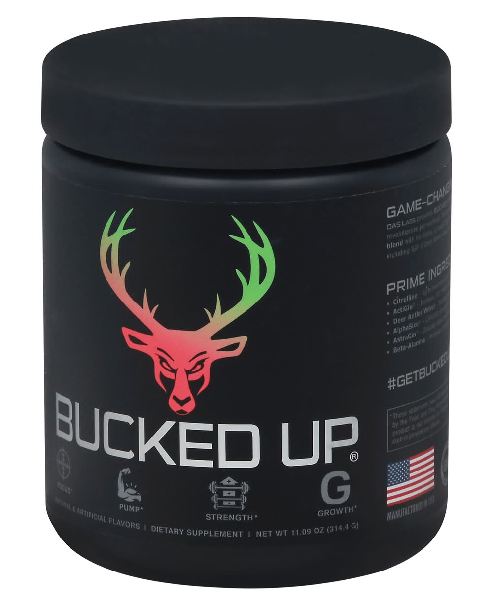 Bucked Up Pre-Workout is a dietary supplement formulated to support workout performance with a blend of ingredients designed for focus, pump, strength, and growth. It contains 6 grams of citrulline to enhance blood flow, ActiGin for potentially increasing VO2 MAX and athletic performance, and Alphasize which may sharpen mental focus. Size: 1