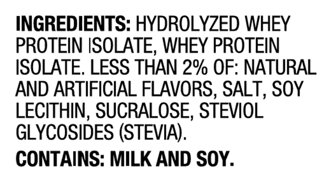 Ingredients: Hydrolyzed Whey Protein Isolate, Whey Protein Isolate, Less than 2% of: Natural and Artificial Flavors, Salt, Soy Lecithin, Sucralose, Steviol Glycosides (Stevia) Contains: Milk, Soybeans