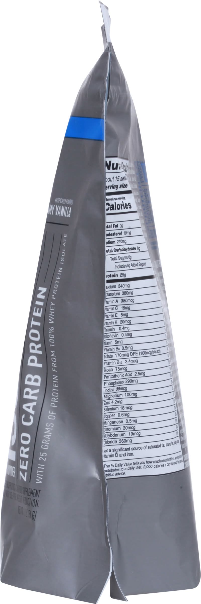 Artificially flavored. With 25 grams of protein from 100% whey protein isolate. 5.5 grams BCAAs per serving (Naturally occurring from whey protein). 4 grams glutamine per serving (Naturally occurring from whey protein). Zero sugar (Not a low calorie food). Gluten & lactose free. Naturally occurring Amino Acid Profile: Essential Amino Acids (EAAs): Isoleucine; Lysine; Methionine; Phenylalanine; Threonine; Tryptophan; Valine; Histidine. Conditionally Essential Amino Acids (CAAs): Arginine; Cysteine; Glutamine & Glutamic Acid; Glycine; Proline; Tyrosine. Non-Essential Amino Acids (NAAs): Alanine; Aspartic Acid; Serine. Total BCAAs 5.5 grams; 11.8 g; 8.3 g; 5 g. About 15 servings. Added vitamin & mineral blend. Naturally occurring protein from 100% whey protein isolate. rBST free (No significant difference has been found between milk derived from rBST-treated and non-rBST treated cows) whey. Quality Protein. Zero Carbs. Pure Results: 25 grams of delicious 100% pure, rBST free (No significant difference has been found between milk derived from rBST-treated and non-rBST treated cows), whey protein isolate with not a carb in sight. 100% whey protein isolate means exceptional purity and quality, excess fat, cholesterol, sugar, carbs, lactose and other fillers are removed to give you everything you need and nothing you don't. And each serving delivers 5.5 grams of naturally occurring BCAAs, 4 grams of naturally occurring glutamine and an added vitamin and mineral blend to help you meet your micronutrient needs. Contents sold by weight, not volume. Contents will settle. Quality Commitment: Isopure products are manufactured in accordance with good manufacturing practices (GMP) established by the U.S. Food and drug administration (FDA). To assure the highest quality and food safety standards, and adhere to label claims, Isopure products are tested by our quality assurance team laboratories. • Flavor: Creamy vanilla • Size: 1 • Number of servings: 15