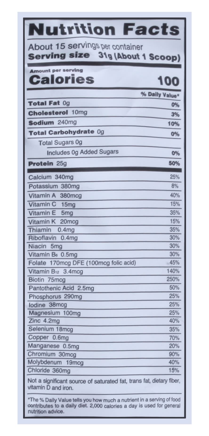 Ingredients: Whey Protein Isolate, Vitamin and Mineral Blend (Dicalcium Phosphate, Potassium Chloride, Magnesium Oxide, Ascorbic Acid, Sodium Chloride, Vitamin E Acetate, Zinc Sulfate, D-Biotin, Niacinamide, Silicon Dioxide, Calcium D-Pantothenate, Vitamin A Acetate, Copper Sulfate, Manganese Sulfate, Pyridoxine Hydrochloride, Riboflavin, Potassium Iodide, Phylloquinone, Thiamin Hydrochloride, Sodium Selenite, Cyanocobalamin, Chromium Chloride, Folic Acid, Sodium Molybdate), Soy Lecithin, Natural and Artificial Flavor, Sucralose, Xanthan Gum Contains: Milk, Soy