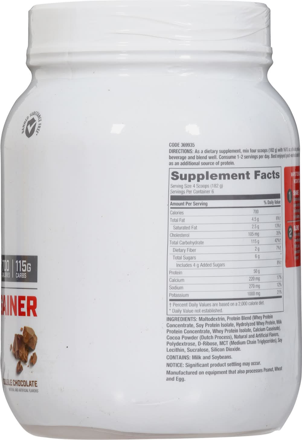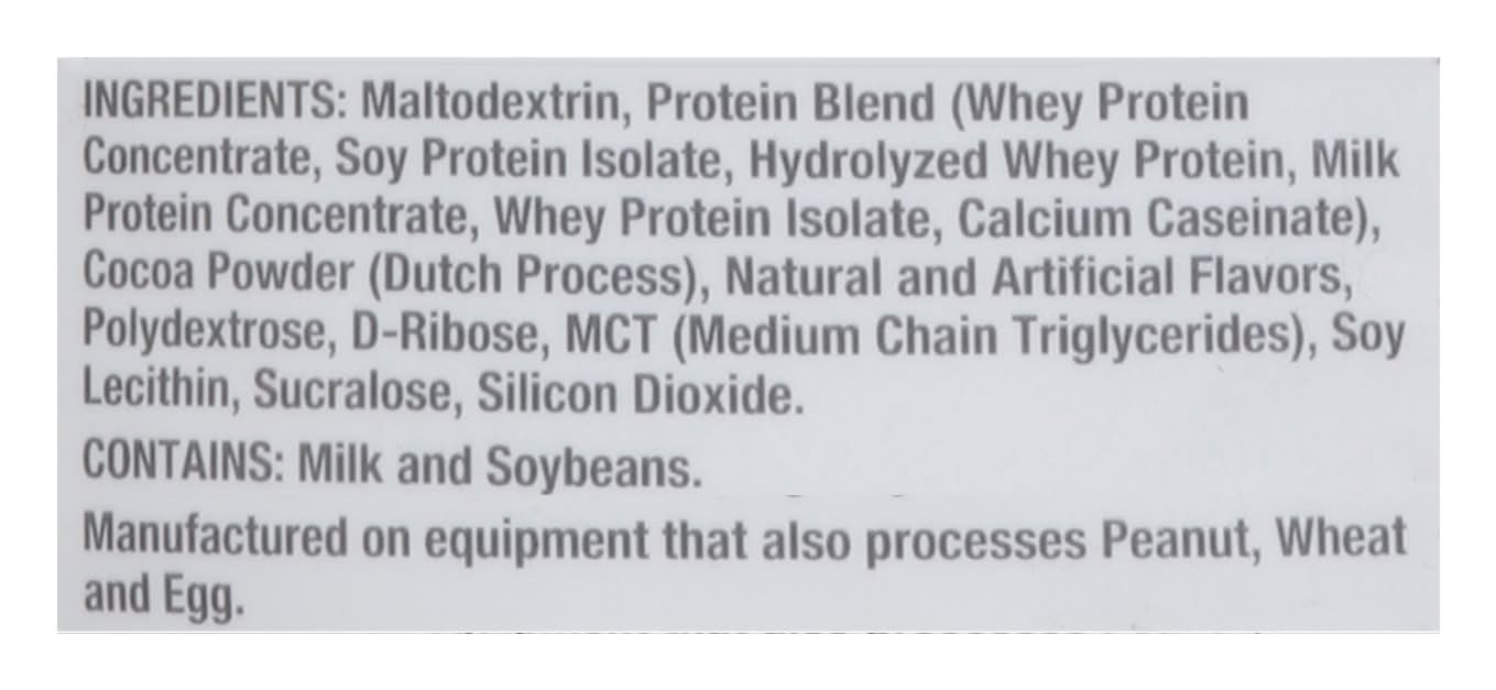 Ingredients: Maltodextrin, Protein Blend (Whey Protein Concentrate, Soy Protein Isolate, Hydrolyzed Whey Protein, Milk Protein Concentrate, Whey Protein Isolate, Calcium Caseinate), Cocoa Powder (Dutch Process), Natural and Artificial Flavors, Polydextrose, D-Ribose, MCT (Medium Chain Triglycerides), Soy Lecithin, Sucralose, Silicon Dioxide Contains: Milk, Soybeans, Peanuts, Wheat, Eggs