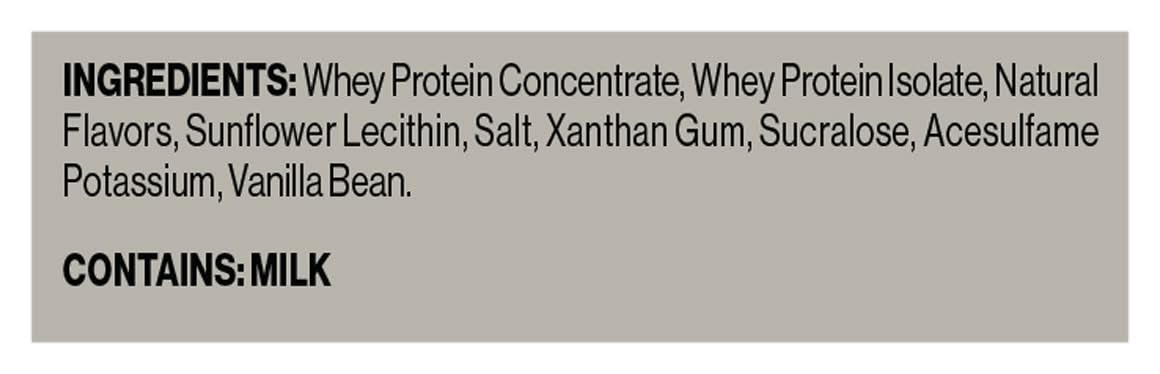 Ingredients: Whey Protein Concentrate, Whey Protein Isolate, Natural Flavors, Sunflower Lecithin, Salt, Xanthan Gum, Sucralose, Acesulfame Potassium, Vanilla Bean Contains: Milk