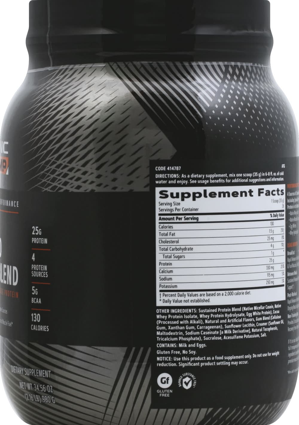 Ingredients: Other Ingredients: Sustained Protein Blend (Native Micellar Casein, Native Whey Protein Isolate, Whey Protein Hydrolysate, Egg White Protein), Cocoa (Processed with Alkali), Natural and Artificial Flavors, Gum Blend (Cellulose Gum, Xanthan Gum, Carrageenan), Sunflower Lecithin, Creamer (Sunflower Oil, Maltodextrin, Sodium Caseinate [a Milk Derivative], Natural Tocopherols, Tricalcium Phosphate), Sucralose, Acesulfame Potassium, Salt Contains: 'Contains Milk', 'Contains Eggs'