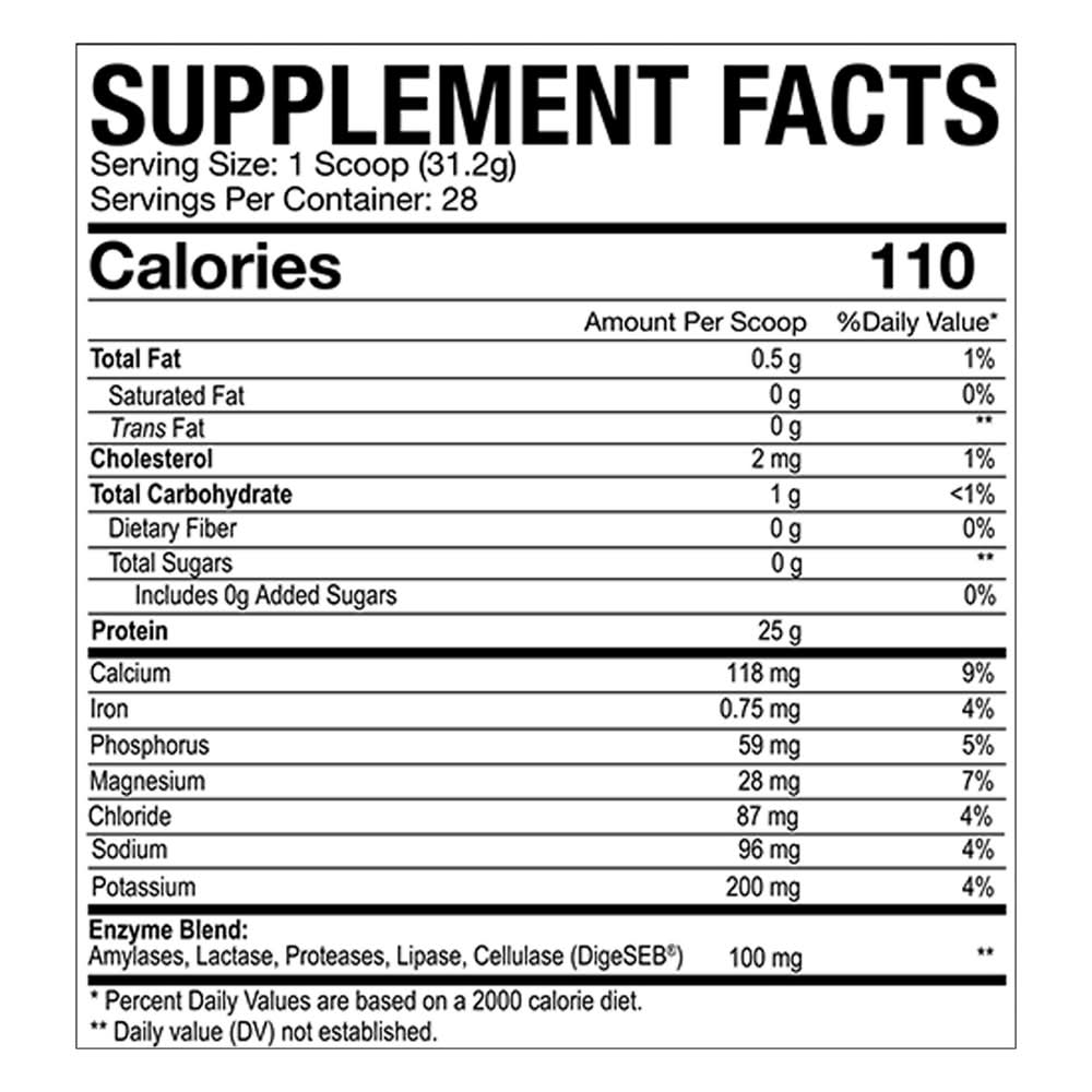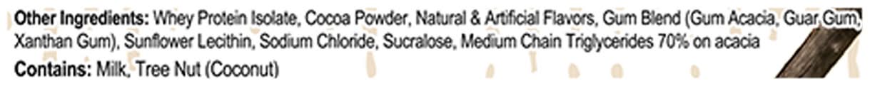 Ingredients: Enzyme Blend: Amylases, Lactase, Proteases, Lipase, Cellulose (DigeSEb). Other Ingredients: Whey Protein Isolate, Cocoa Powder, Natural & Artificial Flavors, Gum Blend (Gum Acacia, Guar Gum, Xanthan Gum), Sunflower Lecithin, Sodium Chloride, Sucralose, Medium Chain Triglycerides 70% on Acacia Contains: Milk, Tree Nuts, Tree Nuts, Coconuts, Eggs, Fish, Molluscan Shellfish, Peanuts, Wheat, Soybeans, Sesame