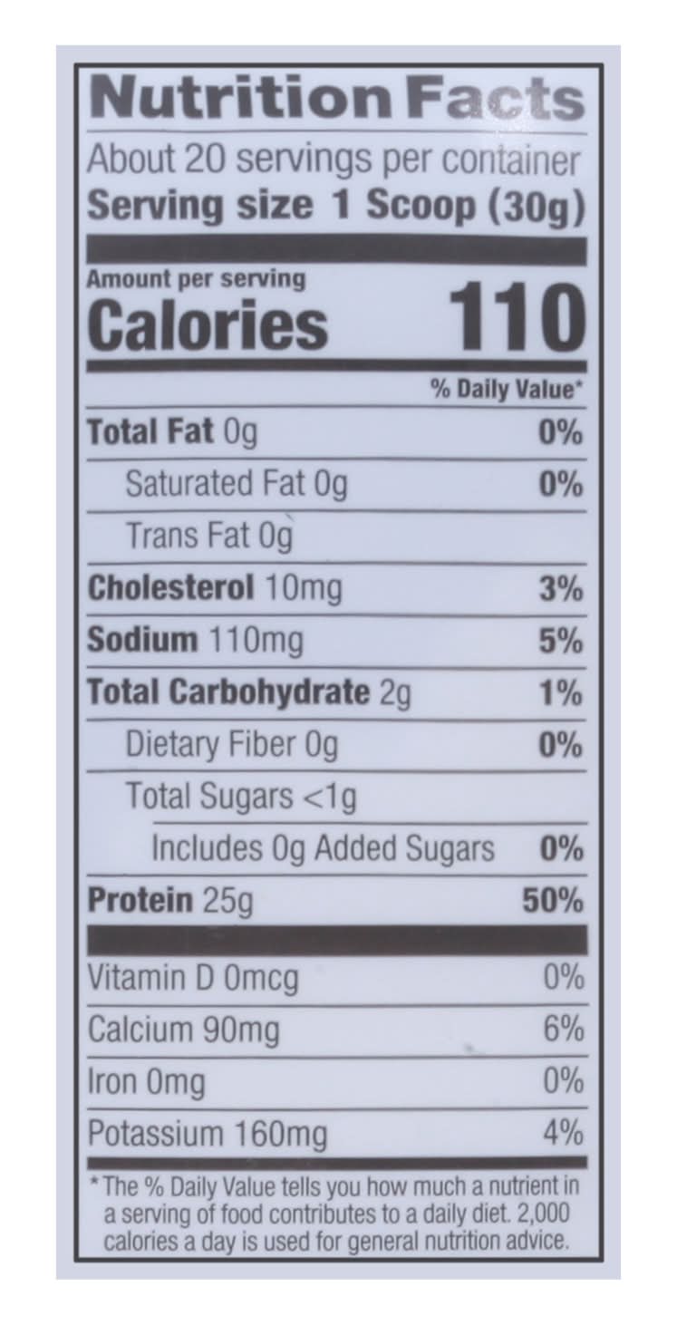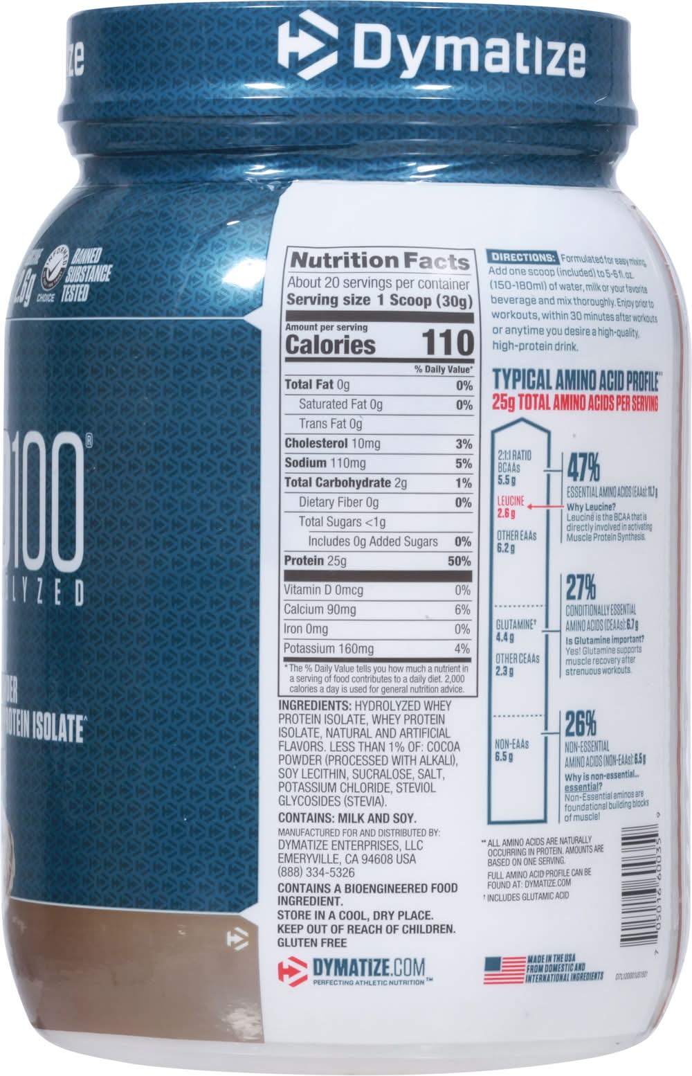 Ingredients: Hydrolyzed Whey Protein Isolate, Whey Protein Isolate, Natural and Artificial Flavors, Less than 1% of: Cocoa Powder (Processed with Alkali), Soy Lecithin, Sucralose, Salt, Potassium Chloride, Steviol Glycosides (Stevia) Contains: Milk, Soybeans