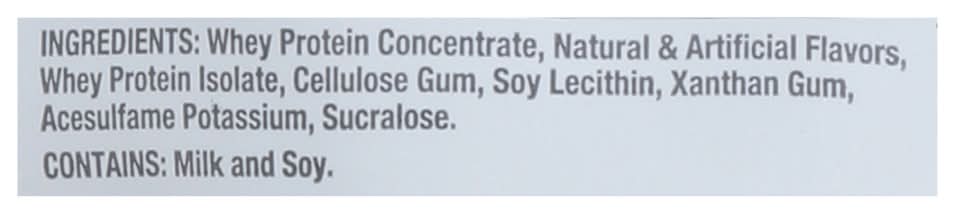 Ingredients: Whey Protein Concentrate, Natural & Artificial Flavors, Whey Protein Isolate, Cellulose Gum, Soy Lecithin, Xanthan Gum, Acesulfame Potassium, Sucralose Contains: Milk, Soybeans