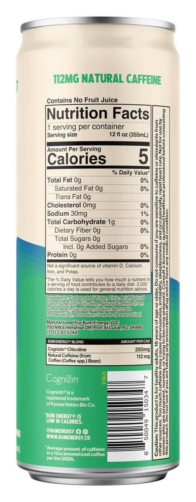 Ingredients: Carbonated Water, Natural and Artifical Flavor, Citric Acid, Cognizin Citicoline, Natural Caffeine (from Coffee Bean), Sucralose, Sodium Benzoate (Preservative), Potassium Sorbate (Preservative)