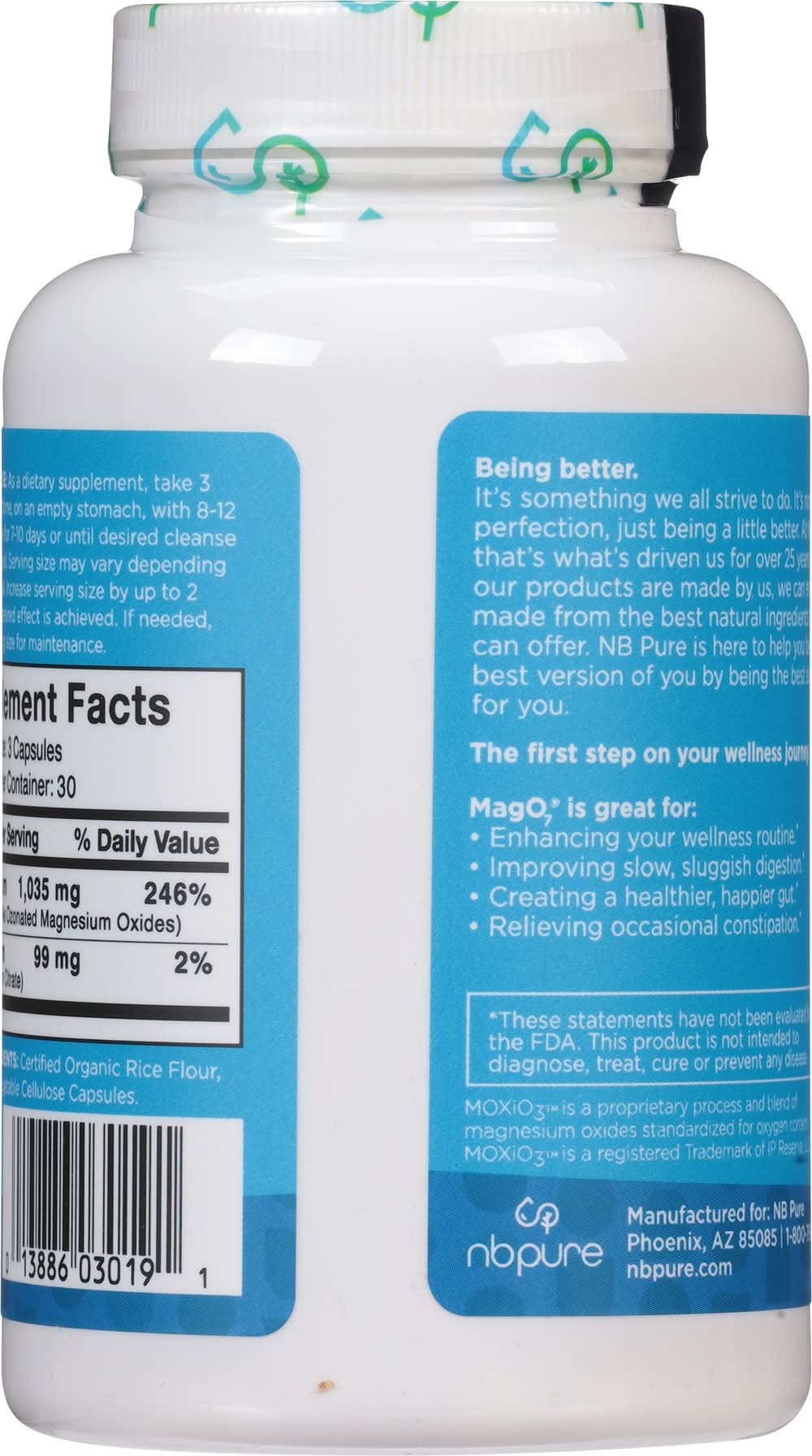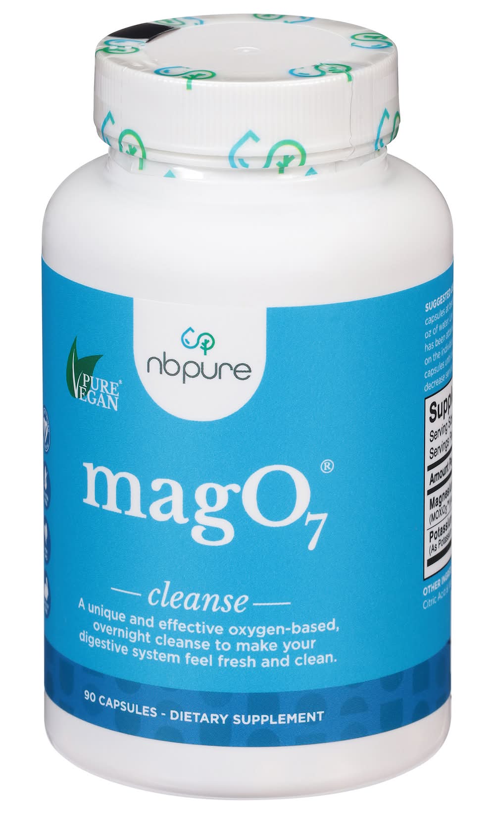 Mago7 is a dietary supplement formulated to provide an oxygen-based overnight cleanse, aiming to refresh and clean the digestive system. Suitable for a vegan diet and free from gluten and GMOs, it contains a proprietary blend of magnesium oxides standardized for oxygen content. The product is designed to support those looking to enhance their wellness routine, improve digestion, contribute to a healthier gut, and relieve occasional constipation. It is noted that the supplement's claims have not been evaluated by the FDA, and it is not intended to diagnose, treat, cure, or prevent any disease. commits to utilizing high-quality, all-natural ingredients. The product is also cruelty-free. • Size: 1 • NB Pure, Phoenix, AZ, 85085 • Packaging: Reusable
