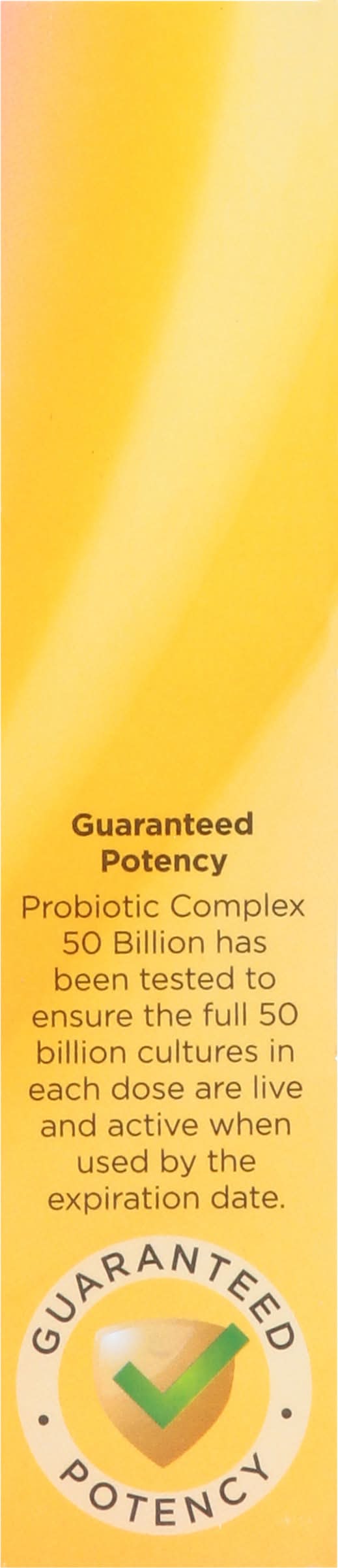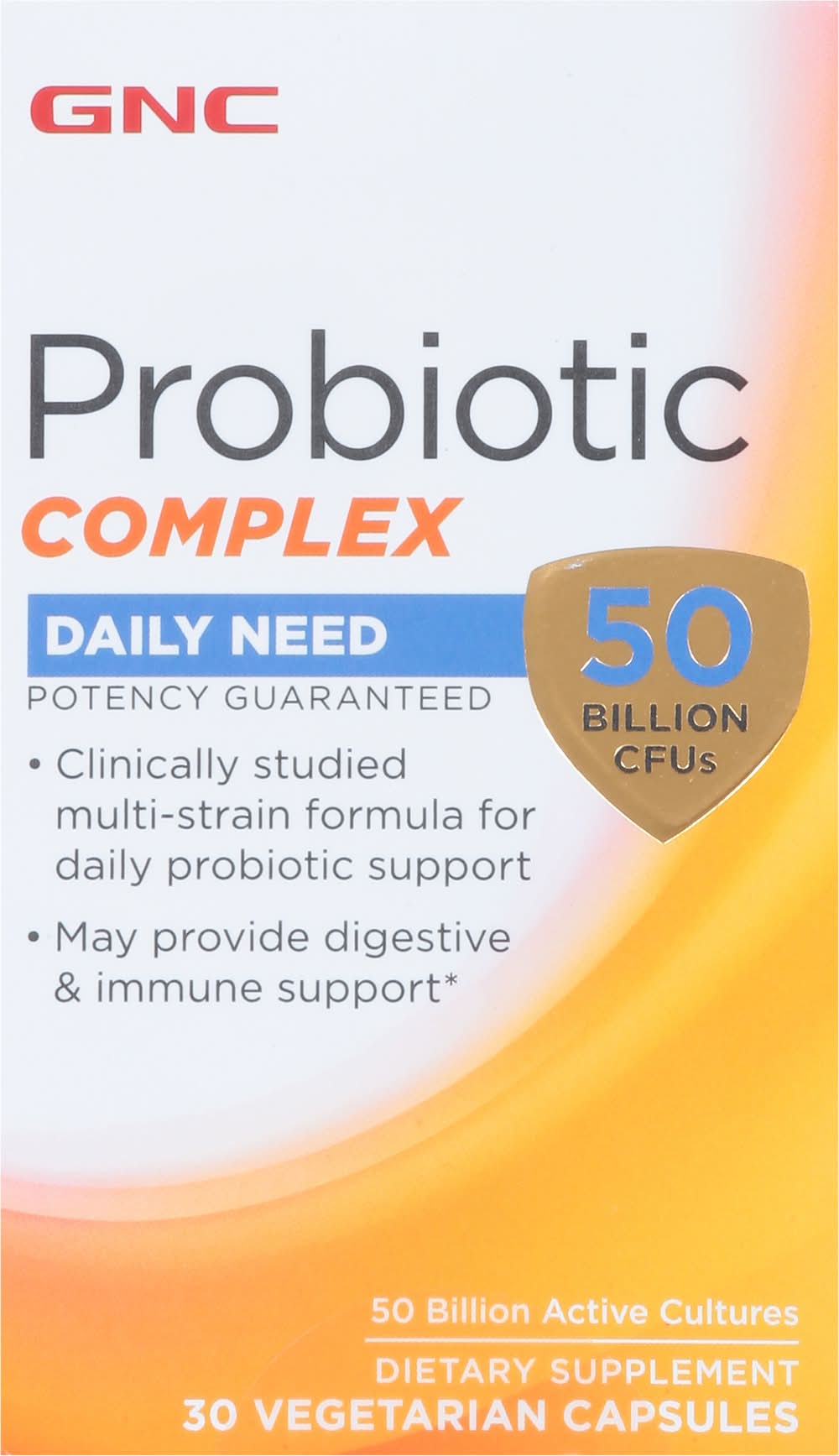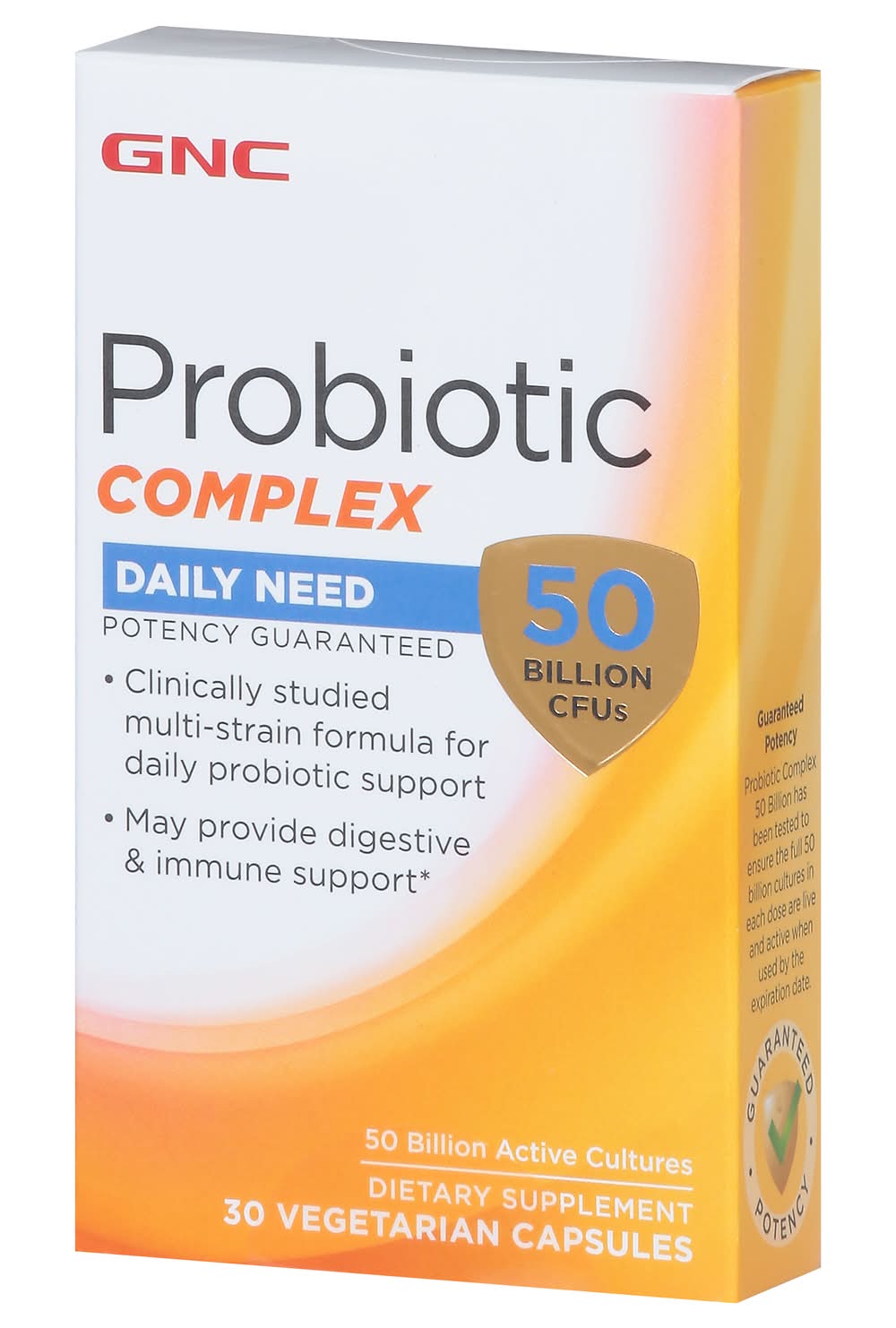 Dietary Supplement Gluten free, lactose free. Potency guaranteed. Clinically studied multi-strain formula for daily probiotic support. May provide digestive & immune support. 50 billion CFUs. 50 billion active cultures. Why GNC Probiotic Complex 50 Billion? Multiple strains of live, active probiotic cultures. Prebiotic FOS. Guaranteed potency through expiration date. No refrigeration necessary. Guaranteed Potency: Probiotic Complex 25 Billion has been tested to ensure the full 25 billion cultures in each dose are live and active when used by the expiration date. For more information: 1-888-462-2548. Shop now (at) GNC.com. (This statement has not been evaluated by the Food and Drug Administration. This product is not intended to diagnose, treat, cure, or prevent any disease.) Made in the UK. Size: 1