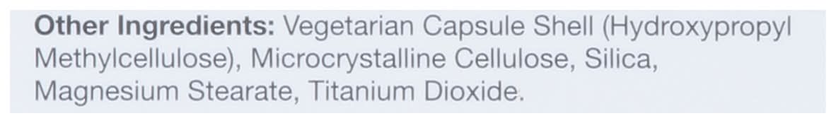 Ingredients: Other Ingredients: Vegetarian Capsule Shell (Hydroxypropyl Methylcellulose), Microcrystalline Cellulose, Silica, Magnesium Stearate, Titanium Dioxide