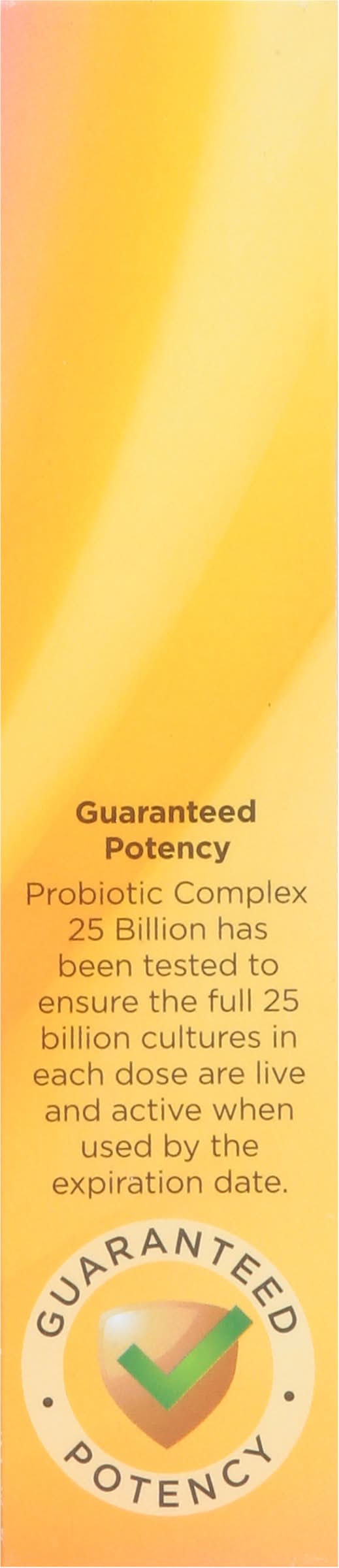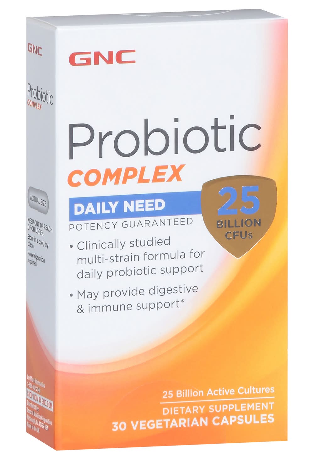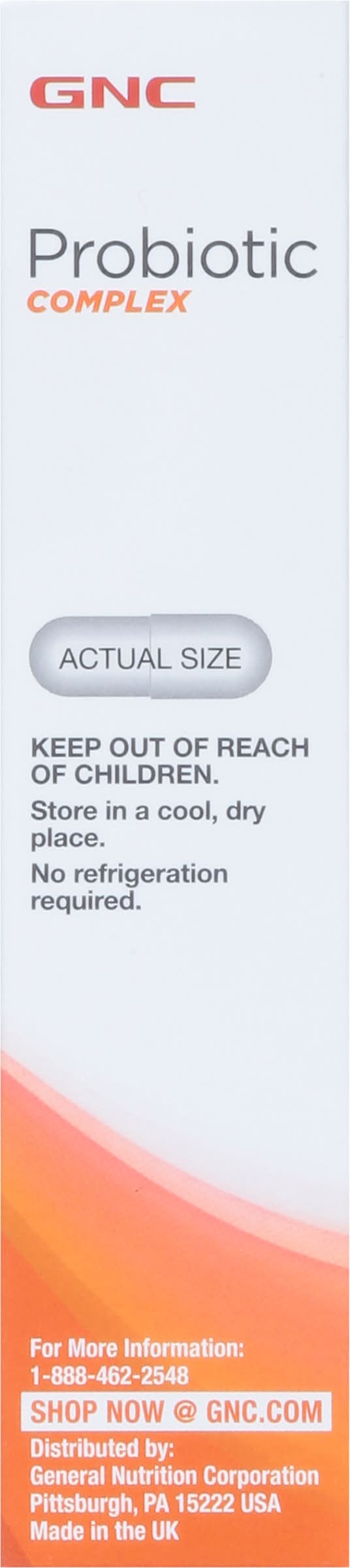 Dietary Supplement Gluten free, lactose free. Potency guaranteed. Clinically studied multi-strain formula for daily probiotic support. May provide digestive & immune support. 25 billion CFUs. 25 billion active cultures. Why GNC Probiotic Complex 25 Billion? Multiple strains of live, active probiotic cultures; Prebiotic FOS; Guaranteed potency through expiration date; No refrigeration necessary; Gluten free; Lactose free. Guaranteed Potency: Probiotic Complex 25 Billion has been tested to ensure the full 25 billion cultures in each dose are live and active when used by the expiration date. GNC.com. For more information: 1-888-462-2548. Show now (at) GNC.com. (This statement has not been evaluated by the Food and Drug Administration. This product is not intended to diagnose, treat, cure, or prevent any disease.) Made in the UK. Size: 1