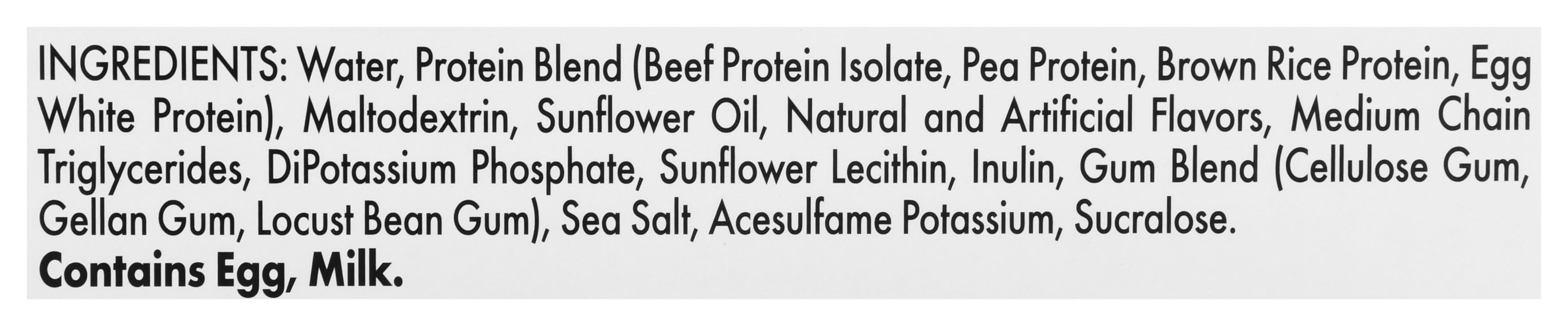 Ingredients: Water, Protein Blend (Beef Protein Isolate, Pea Protein, Brown Rice Protein, Egg White Protein), Maltodextrin, Sunflower Oil, Natural and Artificial Flavors, Medium Chain Triglycerides, Dipotassium Phosphate, Sunflower Lecithin, Inulin, Gum Blend (Cellulose Gum, Gellan Gum, Locust Bean Gum), Sea Salt, Acesulfame Potassium, Sucralose Contains: Eggs, Milk