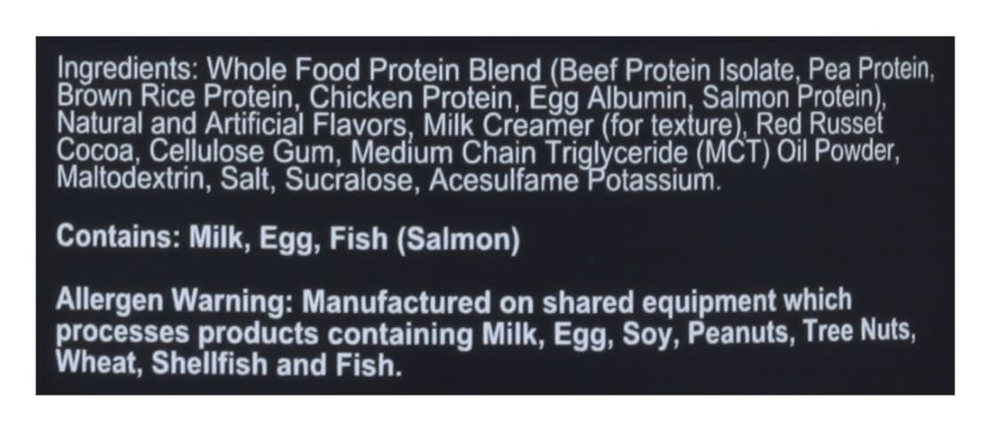 Ingredients: Whole Food Protein Blend (Beef Protein Isolate, Pea Protein, Brown Rice Protein, Chicken Protein, Egg Albumin, Salmon Protein), Natural and Artificial Flavors, Milk Creamer (for Texture), Red Russet Cocoa, Cellulose Gum, Medium Chain Triglyceride (MCT) Oil Powder, Maltodextrin, Salt, Sucralose, Acesulfame Potassium Contains: Eggs, Milk, Fish, Salmon, Fish, Soybeans, Peanuts, Tree Nuts, Wheat, Crustacean Shellfish, Fish