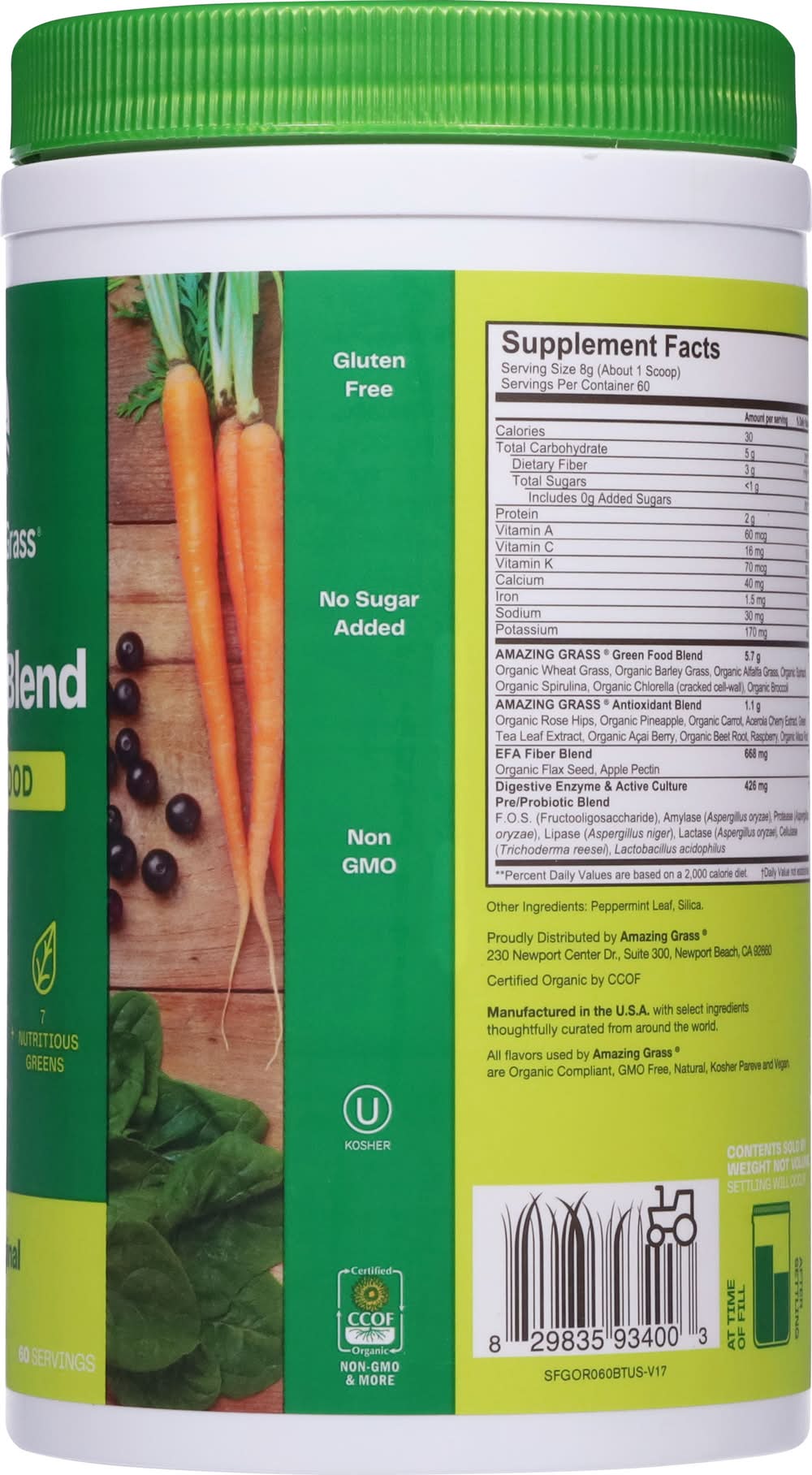 Ingredients: Amazing Grass Green Food Blend: Organic Wheat Grass, Organic Barley Grass, Organic Alfalfa Grass, Organic Spinach, Organic Spirulina, Organic Chlorella (Cracked Cell-Wall), Organic Broccoli. Amazing Grass Antioxidant Blend: Organic Rose Hips, Organic Pineapple, Organic Carrot, Acerola Cherry Extract, Green Tea Leaf Extract, Organic Acai Berry, Organic Beet Root, Raspberry, Organic Maca Root. Efa Fiber Blend: Organic Flax Seed, Apple Pectin. Digestive Enzyme & Active Culture Pre/Probiotic Blend: F.O.S. (Fructooligosaccharide), Amylase (Aspergillus Oryzae), Protease (Aspergillus Oryzae), Lipase (Aspergillus Niger), Lactase (Aspergillus Oryzae), Cellulase (Trichoderma Reesei), Lactobacillus Acidophilus. Other Ingredients: Peppermint Leaf, Silica