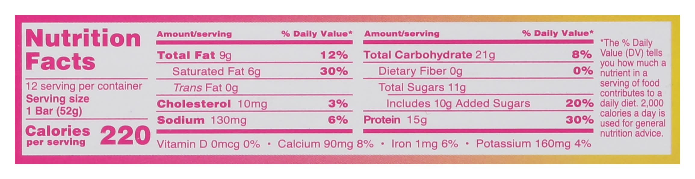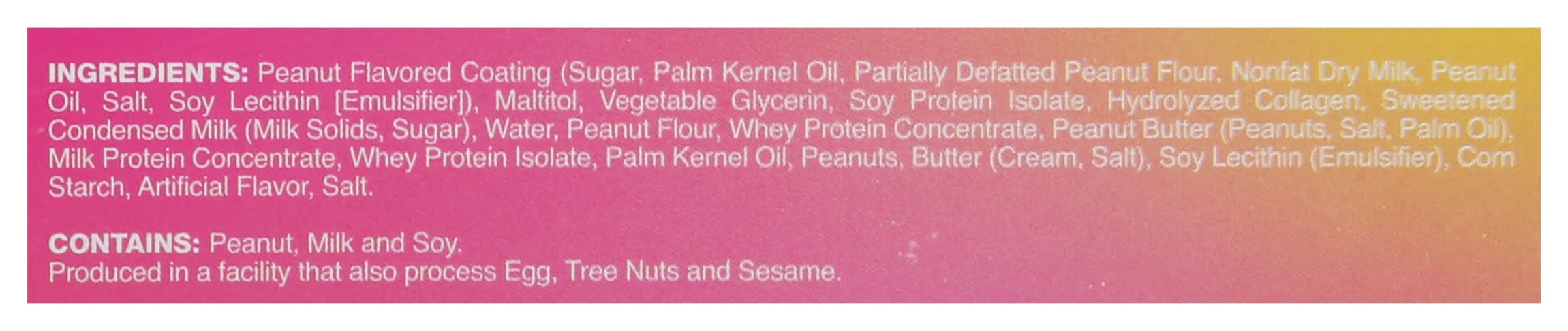 Ingredients: Peanut Flavored Coating (Sugar, Palm Kernel Oil, Partially Defatted Peanut Flour, Nonfat Dry Milk, Peanut Oil, Salt, Soy Lecithin [Emulsifier]), Maltitol, Vegetable Glycerin, Soy Protein Isolate, Hydrolyzed Collagen, Sweetened Condensed Milk (Milk Solids, Sugar), Water, Peanut Flour, Whey Protein Concentrate, Peanut Butter (Peanuts, Salt, Palm Oil), Milk Protein Concentrate, Whey Protein Isolate, Palm Kernel Oil, Peanuts, Butter (Cream, Salt), Soy Lecithin (Emulsifier), Corn Starch, Artificial Flavor, Salt Contains: Peanuts, Milk, Soybeans, Corn, Eggs, Tree Nuts, Sesame