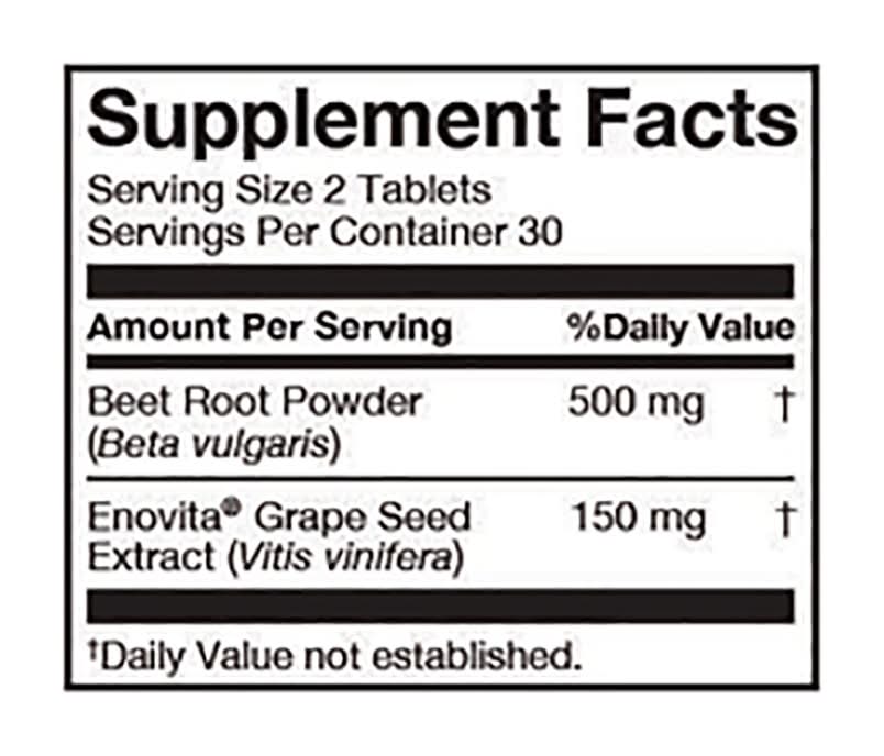 Dietary Supplement. Blood pressure support. Gluten free. Non GMO. Blood pressure support. Heart healthy energy support (According to IQVIA ProVoice Survey 2023). No. 1 doctor, pharmacist & cardiologist recommended. Beet brand for heart health support. Nearly 2x more effective healthy blood pressure support. Than diet and exercise alone from clinically researched grape seed extract (In a 16-week, double-blind, placebo-controlled study involving 119 healthy men and women, heart tablets' polyphenol compound, taken as part of a healthy lifestyle was clinically shown nearly 2-times as effective at promoting normal blood pressure already in the normal range as a healthy lifestyle alone). Blood pressure support. Game-changing tablet. Heart health and blood pressure support with SlideTech Tablet Technology for a easy to swallow, smooth coating, with no artificial colors. Heart Health Support: SuperBeets Heart Tablets features non-GMO beetroot along with clinically researched grape seed extract to help support healthy blood pressure, heart healthy energy, healthy blood circulation and blood flow, increased nitric oxide (N.O.) production, and reduced oxidative stress. Plant based. No artificial sweeteners or synthetic colors.Join Our Heart Health Community for Exclusive Giveaways, Education and Access. Please recycle. (These statements have not been evaluated by the Food and Drug Administration. This product is not intended to diagnose, treat, cure, or prevent any disease.) Made in the USA with globally sourced ingredients. Packaging: Reusable