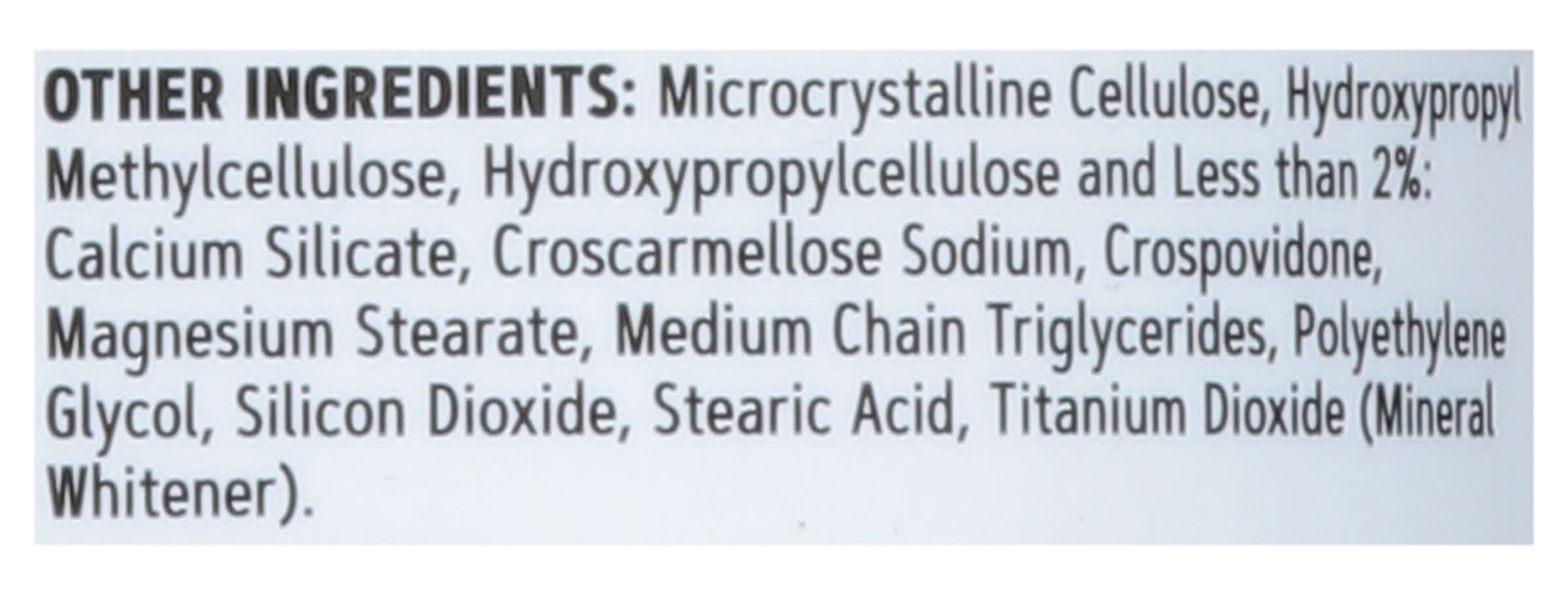 Ingredients: Other Ingredients: Microcrystalline Cellulose, Hydroxypropyl Methylcellulose, Hydroxypropylcellulose and Less than 2%: Calcium Silicate, Croscarmellose Sodium, Crospovidone, Magnesium Stearate, Medium Chain Triglycerides, Polyethylene Glycol, Silicon Dioxide, Stearic Acid, Titanium Dioxide (Mineral Whitener)