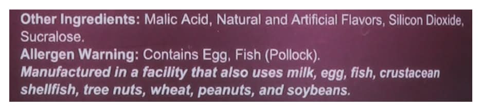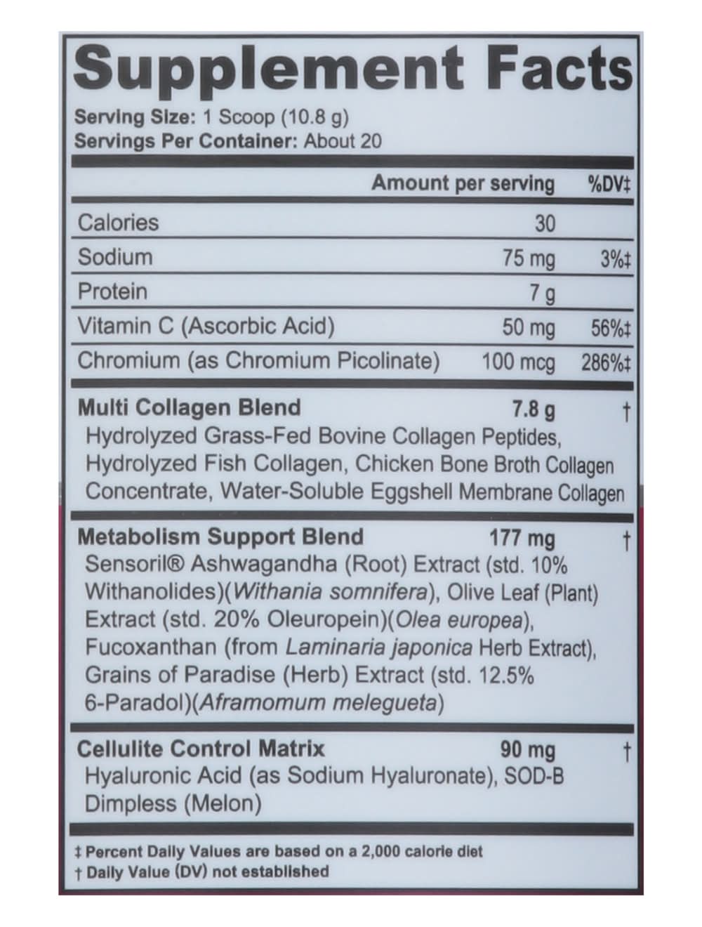 Ingredients: Multi Collagen Blend (Daily Value (DV) Not Established): Hydrolyzed Grass-Fed Bovine Collagen Peptides, Hydrolyzed Fish Collagen, Chicken Bone Collagen Concentrate, Water-Soluble Eggshell Membrane Collagen, Metabolism Support Blend (Daily Value (DV) Not Established): Sensoril Ashwagandha (Root) Extract (Std, 10% Withanolides)(Withania Somnifera), Olive Leaf (Plant) Extract (Std, 20% Oleuropein) (Olea Europea), Fucoxanthan (from Laminaria Japonica Herb Extract), Grains of Paradise (Herb) Extract (Std, 12.5% 6-Paradol) Aframomum Melegueta), Cellulite Control Matrix (Daily Value (DV) Not Established): Hyaluronic Acid (as Sodium Hyaluronate), Sod-B Dimpless (Melon). Other Ingredients: Malic Acid, Natural and Artificial Flavors, Sillicon Dioxide, Sucralose Contains: Eggs, Fish, Pollock, Milk, Eggs, Fish, Crustacean Shellfish, Tree Nuts, Wheat, Peanuts, Soybeans