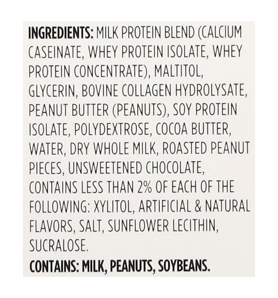 Ingredients: Milk Protein Blend (Calcium Caseinate, Whey Protein Isolate, Whey Protein Concentrate), Maltitol, Glycerin, Bovine Collagen Hydrolysate, Peanut Butter (Peanuts), Soy Protein Isolate, Polydextrose, Cocoa Butter, Water, Dry Whole Milk, Roasted Peanut Pieces, Unsweetened Chocolate, Contains Less than 2% of Each of the Following: Xylitol, Artificial & Natural Flavors, Salt, Sunflower Lecithin, Sucralose Contains: Milk, Peanuts, Soybeans, Wheat, Gluten, Sesame, Tree Nuts, Eggs