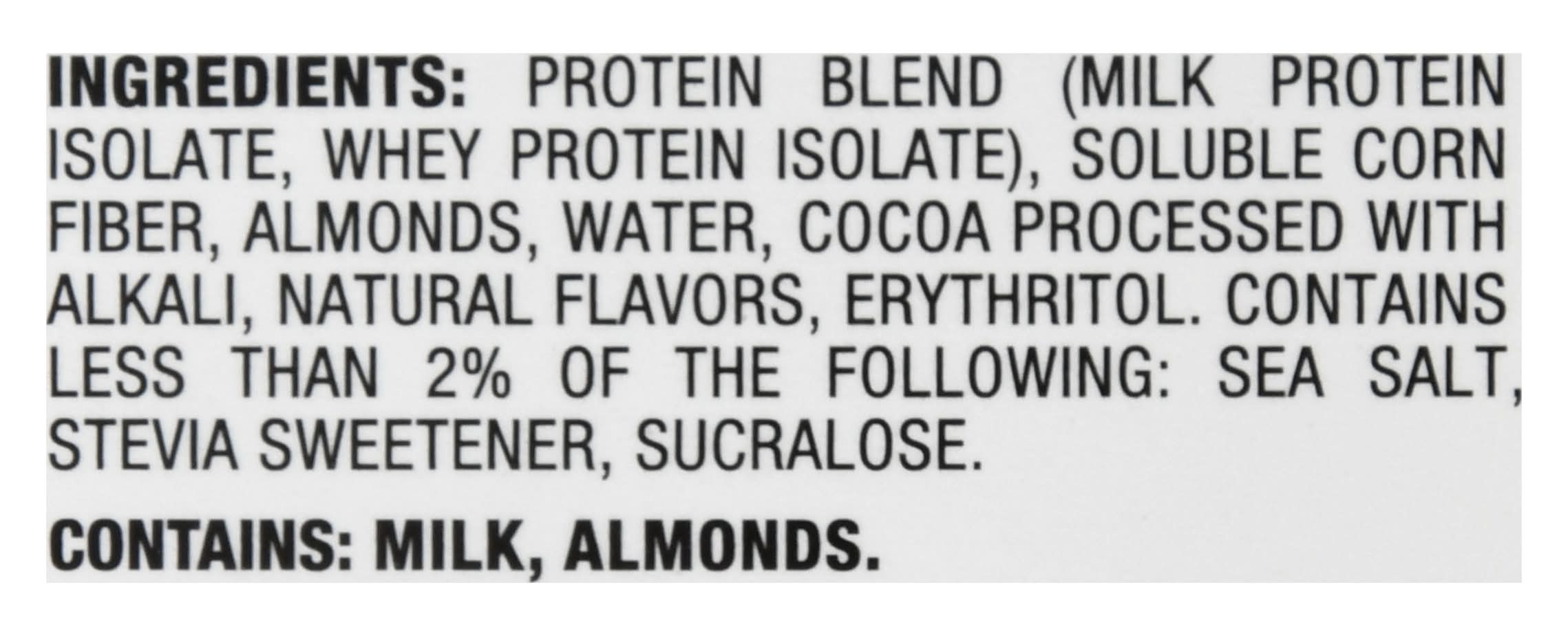 Ingredients: Protein Blend (Milk Protein Isolate, Whey Protein Isolate), Soluble Corn Fiber, Almonds, Water, Cocoa Processed with Alkali, Natural Flavors, Erythritol. Contains Less than 2% of the Following: Sea Salt, Stevia Sweetener, Sucralose Contains: Milk, Tree Nuts, Almonds, Corn, Eggs, Peanuts, Soybeans, Wheat, Tree Nuts