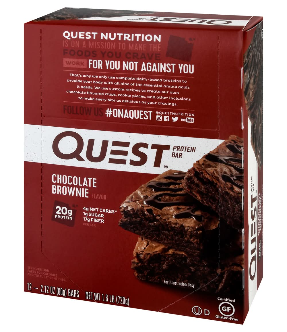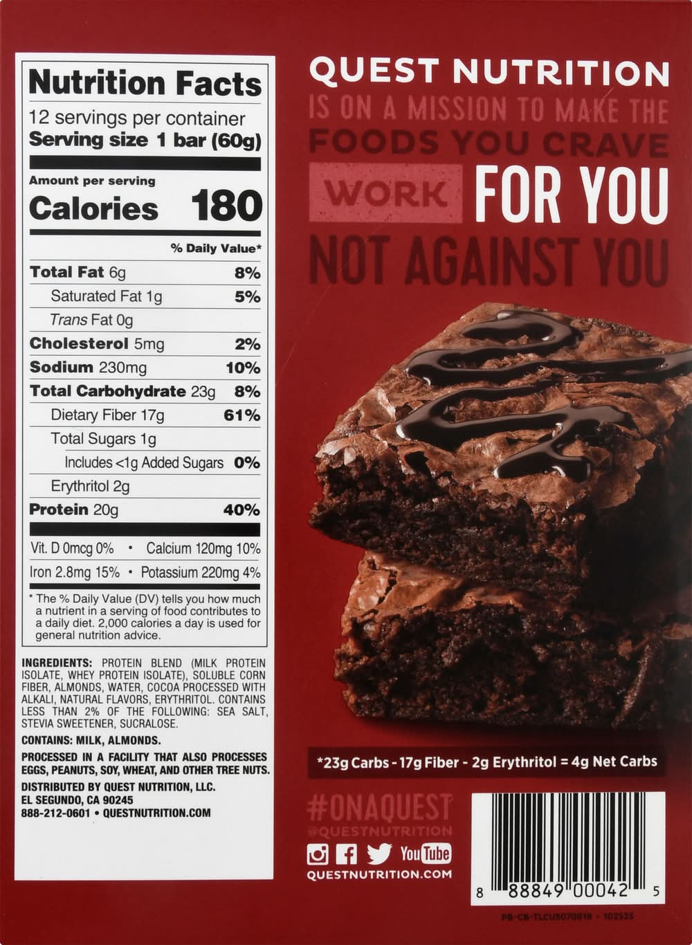 Protein Bar, Chocolate Brownie Flavor • Size: 1 • Number of servings: 12 • Quest Nutrition, El Segundo, CA, 90245, Ph: 888-212-0601
