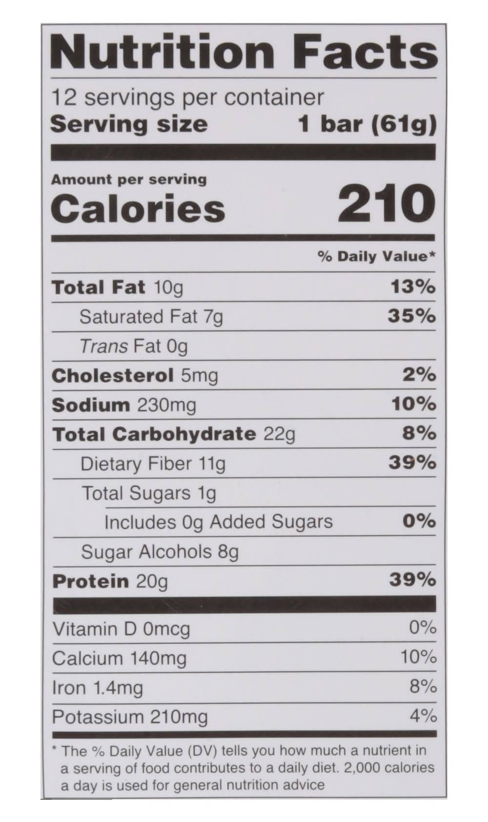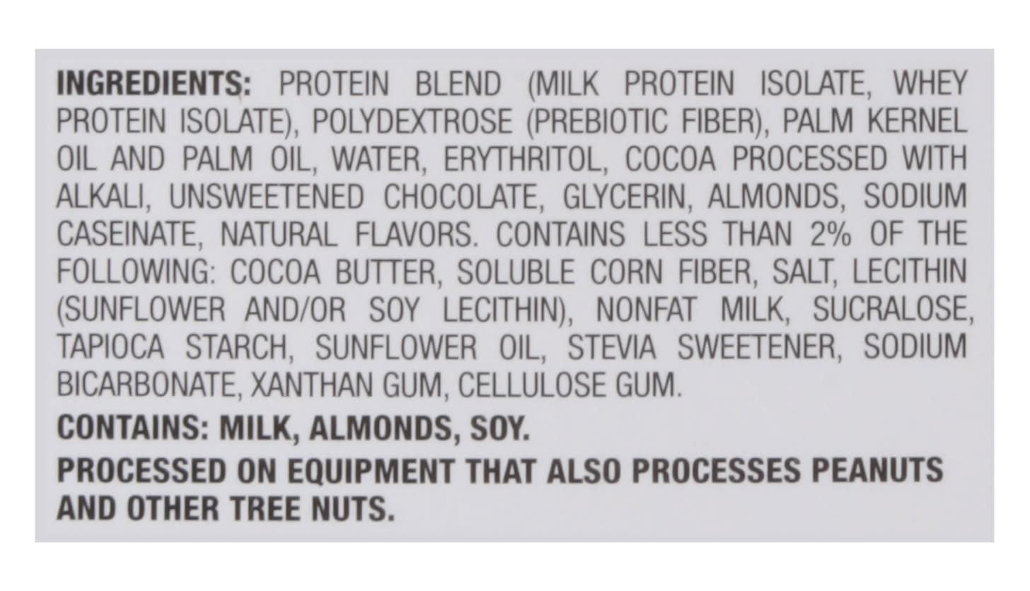 Ingredients: Protein Blend (Milk Protein Isolate, Whey Protein Isolate), Polydextrose (Prebiotic Fiber), Palm Kernel Oil and Palm Oil, Water, Erythritol, Cocoa Processed with Alkali, Unsweetened Chocolate, Glycerin, Almonds, Sodium Caseinate, Natural Flavors, Contains Less than 2% of the Following: Cocoa Butter, Soluble Corn Fiber, Salt, Lecithin (Sunflower and/or Soy Lecithin), Nonfat Milk, Sucralose, Tapioca Starch, Sunflower Oil, Stevia Sweetener, Sodium Bicarbonate, Xanthan Gum, Cellulose Gum Contains: Milk, Tree Nuts, Almonds, Soybeans, Peanuts, Tree Nuts