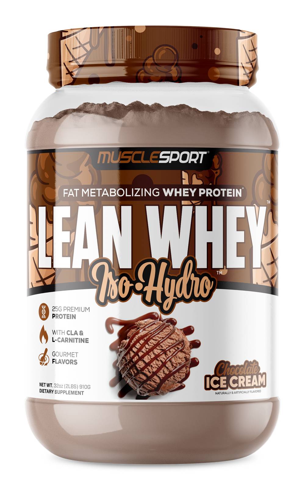 MuscleSport - Lean Whey Protein: Iso-Hydro - Chocolate Ice Cream MuscleSport's Lean Whey Iso Hydro is a premium protein supplement formulated by the Supp Chef who is the worldwide leader in gourmet flavored protein options. Lean Whey Iso Hydro boasts the highest quality and most easy digestible protein sources available. Lean Whey separates itself from the competiton by utilizing a Fat Metabolizing Matrix. A Blend of Fibersol Fiber, L-Carnitine, CLA (conjugated lonoleic acid) and MCT's, synergestically working together in optimizing your body's fat metabolism* • 120 Calories • 25g Premium Protein • Supports Fat Burning* • With CLA, MCT's & L-Carnitine • Good source of Fiber • Gourmet Flavors • Keto Friendly • Flavor: Chocolate ice cream • Size: 1