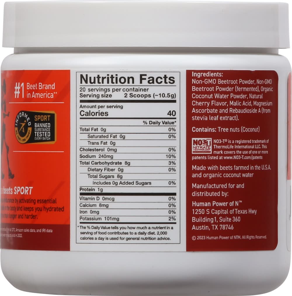 Ingredients: Non-GMO Beetroot Powder, Non-GMO Beetroot Powder (Fermented), Organic Coconut Water Powder, Natural Cherry Flavor, Malic Acid, Magnesium Ascorbate and Rebaudioside A [from Stevia Leaf Extract) Contains: Tree Nuts, Coconuts