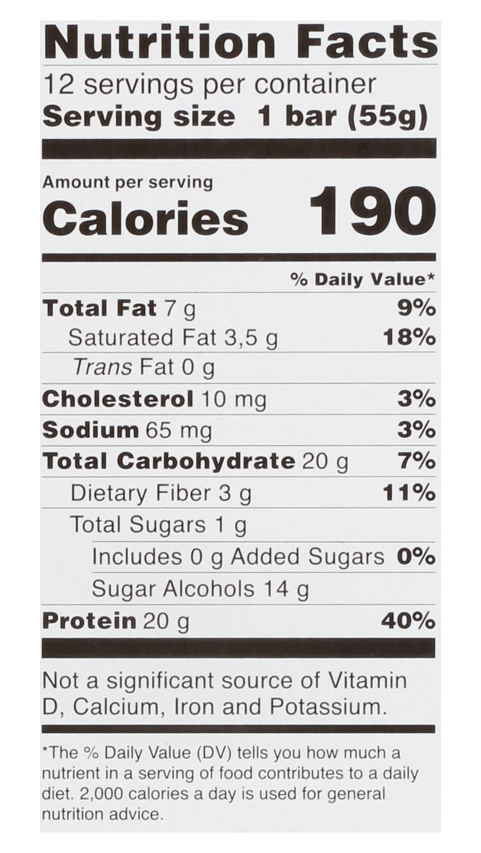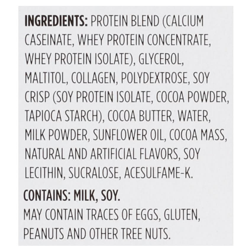 Ingredients: Protein Blend (Calcium Caseinate, Whey Protein Concentrate, Whey Protein Isolate), Glycerol, Maltitol, Collagen, Polydextrose, Soy Crisp (Soy Protein Isolate, Cocoa Powder, Tapioca Starch), Cocoa Butter, Water, Milk Powder, Sunflower Oil, Cocoa Mass, Natural and Artificial Flavors, Soy Lecithin, Sucralose, Acesulfame-K Contains: Milk, Soybeans, Eggs, Gluten, Peanuts, Tree Nuts