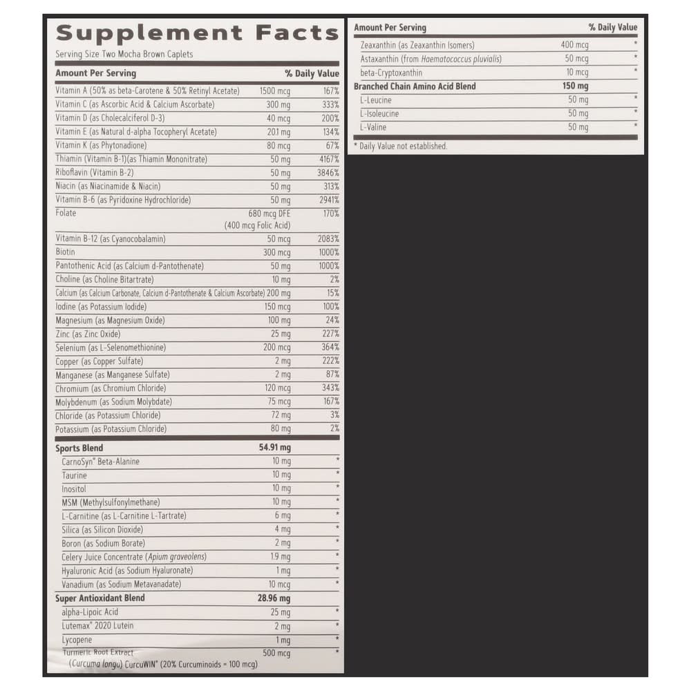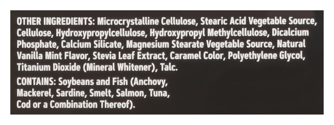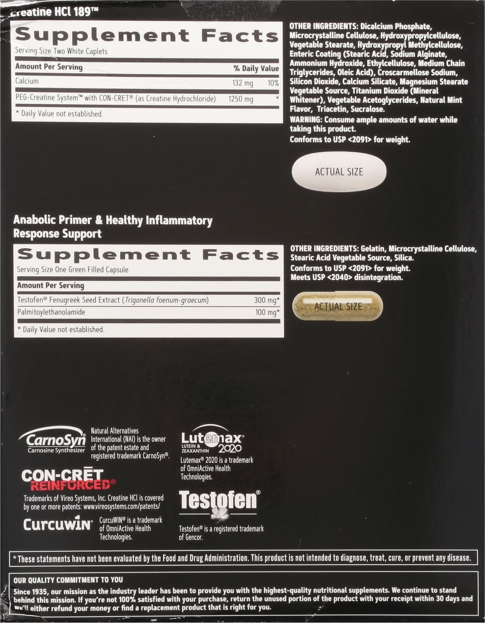 Ingredients: Mega Men Sport Multivitamin: Microcrystalline Cellulose, Stearic Acid Vegetable Source, Cellulose, Hydroxypropylcellulose, Hydroxypropyl Methylcellulose, Dicalcium Phosphate, Calcium Silicate, Magnesium Stearate Vegetable Source, Natural Vanilla Mint Flavor, Stevia Leaf Extract, Caramel Color, Polyethylene Glycol, Titanium Dioxide (Mineral Whitener), Talc. Creatine HCI 189: Other Ingredients: Dicalcium Phosphate, Microcrystalline Cellulose, Hydroxypropylcellulose, Vegetable Stearate, Hydroxypropyl Methylcellulose, Enteric Coating (Stearic Acid, Sodium Alginate, Ammonium Hydroxide, Ethylcellulose, Medium Chain Triglycerides, Oleic Acid), Croscarmellose Sodium, Silicon Dioxide, Calcium Silicate, Magnesium Stearate Vegetable Source, Titanium Dioxide (Mineral Whitener), Vegetable Acetoglycerides, Natural Mint Flavor, Triacetin, Sucralose. Anabolic Primer & Healthy Inflammatory Response Support: Gelatin, Microcrystalline Cellulose, Stearic Acid Vegetable Source, Silica. Contains: Soybeans, Fish, Anchovy, Fish, Mackerel, Fish, Sardines, Fish, Salmon, Fish, Tuna, Fish, Cod