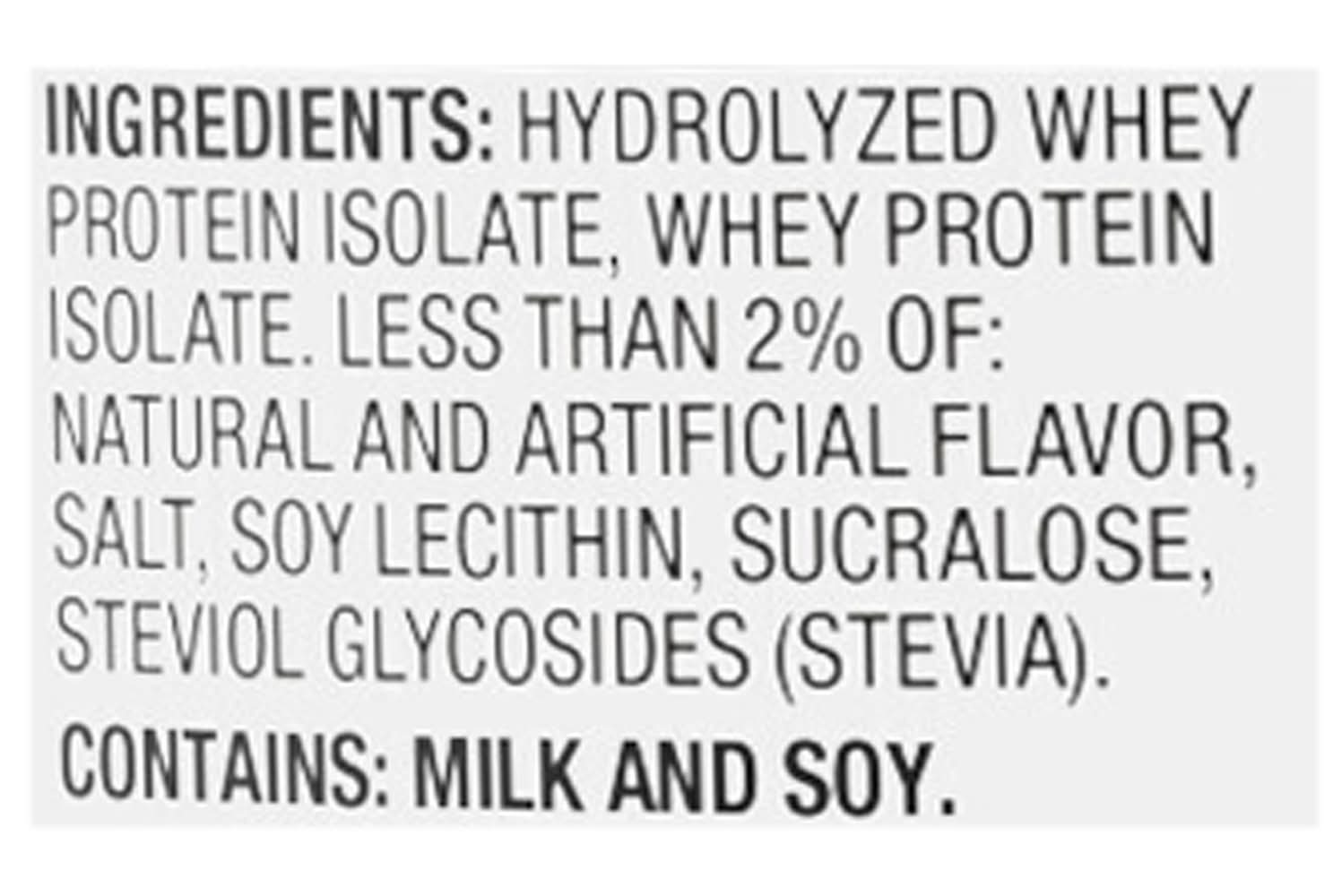 Ingredients: Hydrolyzed Whey Protein Isolate, Whey Protein Isolate, Less than 2% of: Natural and Artificial Flavor, Salt, Soy Lecithin, Sucralose, Steviol Glycosides (Stevia) Contains: Milk, Soybeans