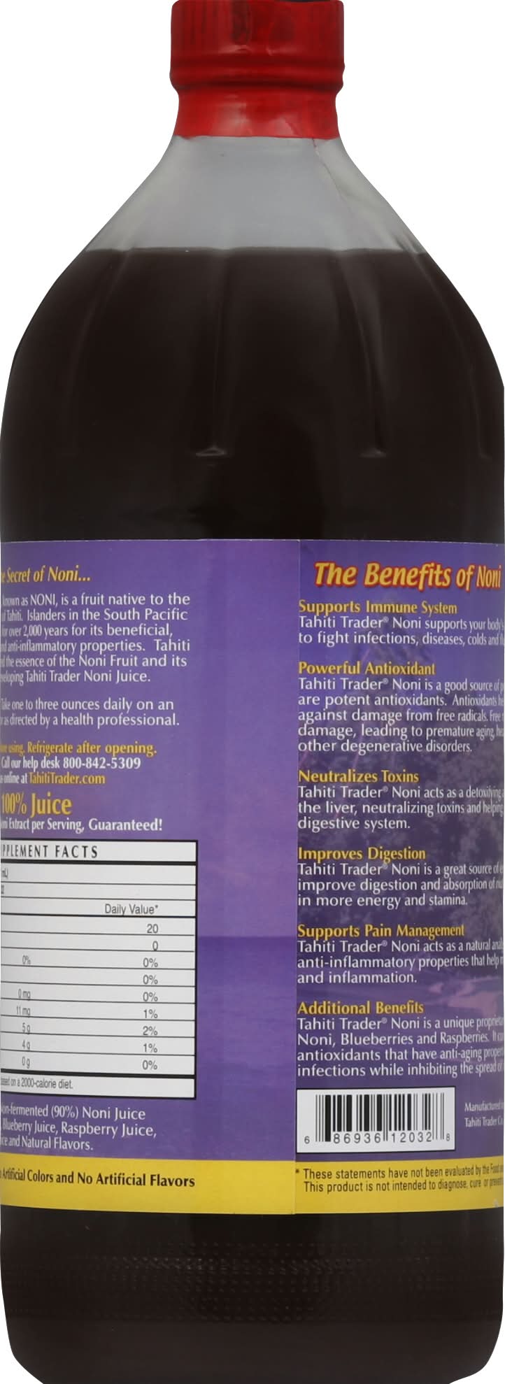 Ingredients: Fresh Non-Fermented (90%) Noni Juice (Morinda Citrifolia), Blueberry Juice, Raspberry Juice, Grape Juice, Pear Juice and Natural Flavors