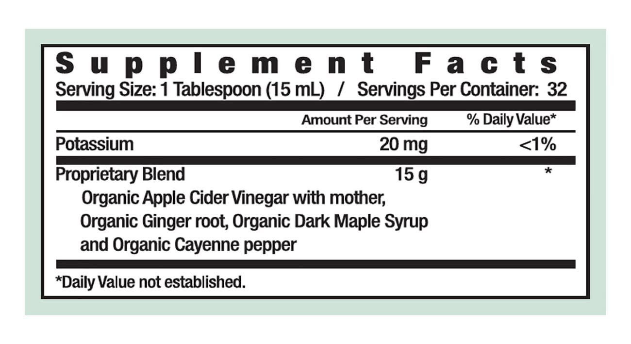 Ingredients: Proprietary Blend: Organic Apple Cider Vinegar with Mother, Organic Ginger Root, Organic Dark Maple Syrup and Organic Cayenne Pepper.