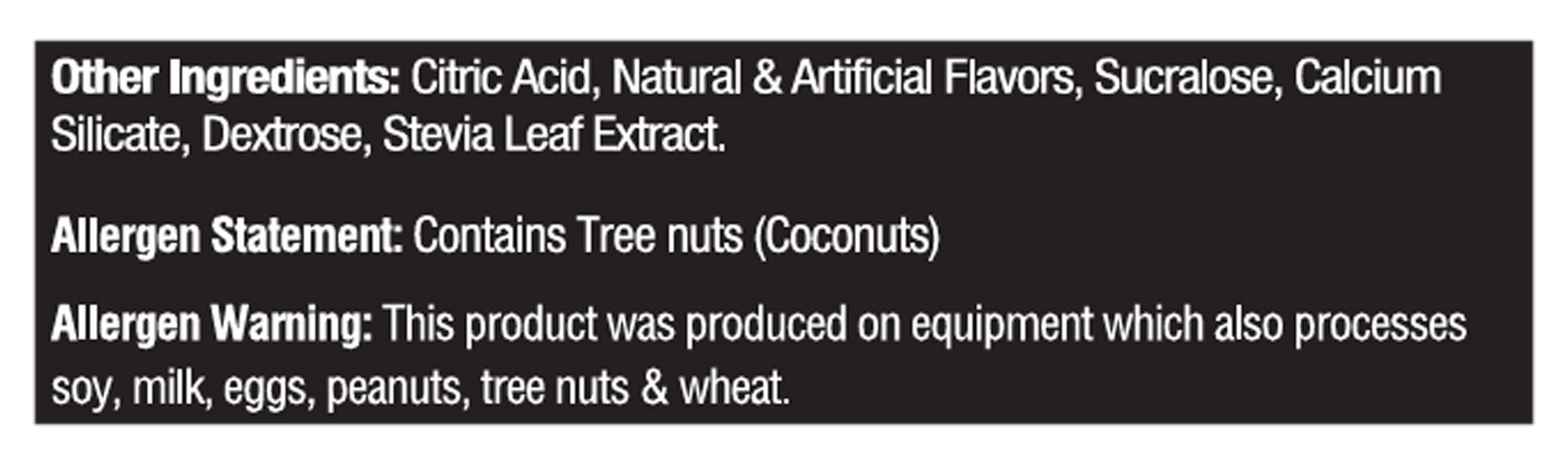 Ingredients: Electrorev Hydration Matrix: Magnesium Glycinate, Sodium Chloride, Potassium Chloride, Astragin: (Proprietary Blend (Astragalus Membranaceus Extract (Root) & Panax Notoginseng Extract (Root)). Other Ingredients: Citric Acid, Natural & Artificial Flavors, Sucralose, Calcium Silicate, Dextrose, Stevia Leaf Extract Contains: Tree Nuts, Coconuts, Tree Nuts, Soybeans, Milk, Eggs, Peanuts, Tree Nuts, Wheat