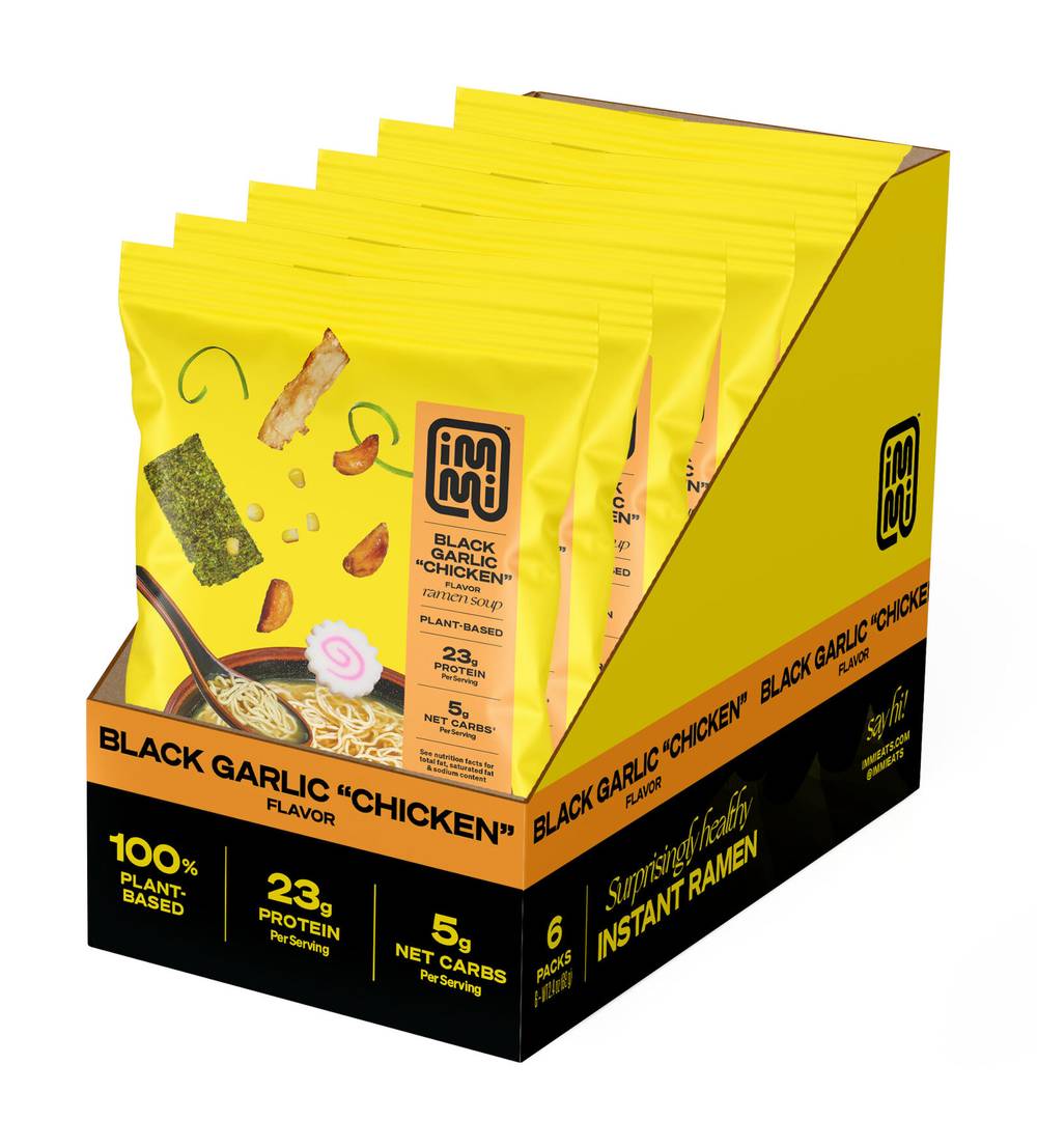 immi™ - Black Garlic "Chicken" Ramen - 6 Packs • Plant-Based • 21g Protein per serving • 6g Net Carbs per serving - 24 Total Carbs - 18g Dietary Fiber • 14g Total Fat Size: 1