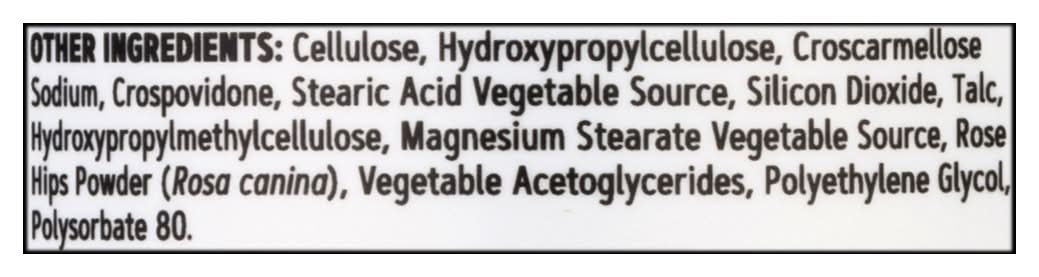 Ingredients: Cellulose, Hydroxypropylcellulose, Croscarmellose Sodium, Crospovidone, Stearic Acid Vegetable Source, Silicon Dioxide, Talc, Hydroxypropylmethylcellulose, Magnesium Stearate Vegetable Source, Rose Hips Powder (Rosa Canina), Vegetable Acetoglycerides, Polyethylene Glycol, Polysorbate 80