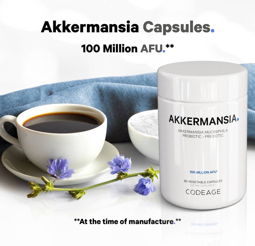 Codeage Akkermansia is a premium supplement formulated for gut health, GI barrier function, intestinal walls, and overall digestive wellness support. It pairs akkermansia muciniphila with chicory inulin, a chicory root fiber, to offer probiotic, prebiotic, and synbiotic benefits. This formula delivers 100 million AFUs of akkermansia probiotics per serving. 3-month supply. Codeage Akkermansia supplement features a premium probiotic blend of akkermansia muciniphila and chicory inulin, specifically formulated to offer probiotic, prebiotic, and daily synbiotic benefits. This unique combination aims to support overall gut health, immune system, and wellness. This advanced akkermansia probiotics formula provides 100 million AFUs (active fermentation units) per serving. Adding chicory root fiber, a type of soluble fiber