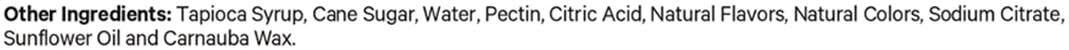 Ingredients: Other Ingredients: Tapioca Syrup, Cane Sugar, Water, Pectin, Citric Acid, Natural Flavors, Natural Colors, Sodium Citrate, Sunflower Oil and Carnauba Wax