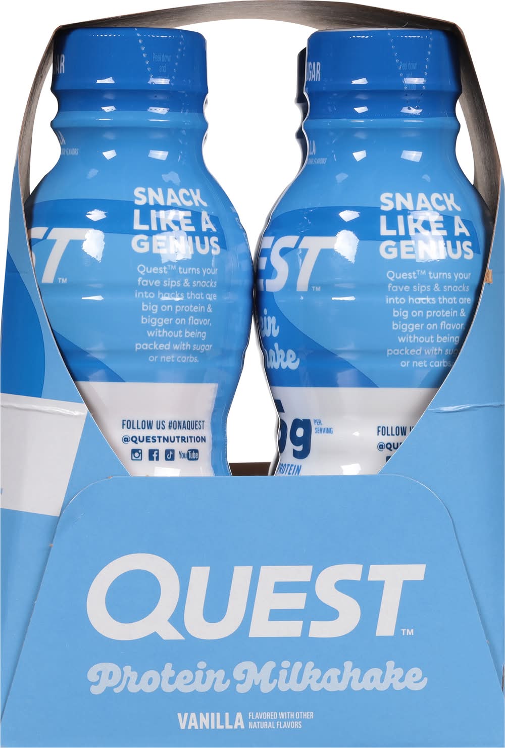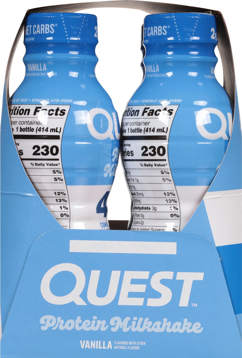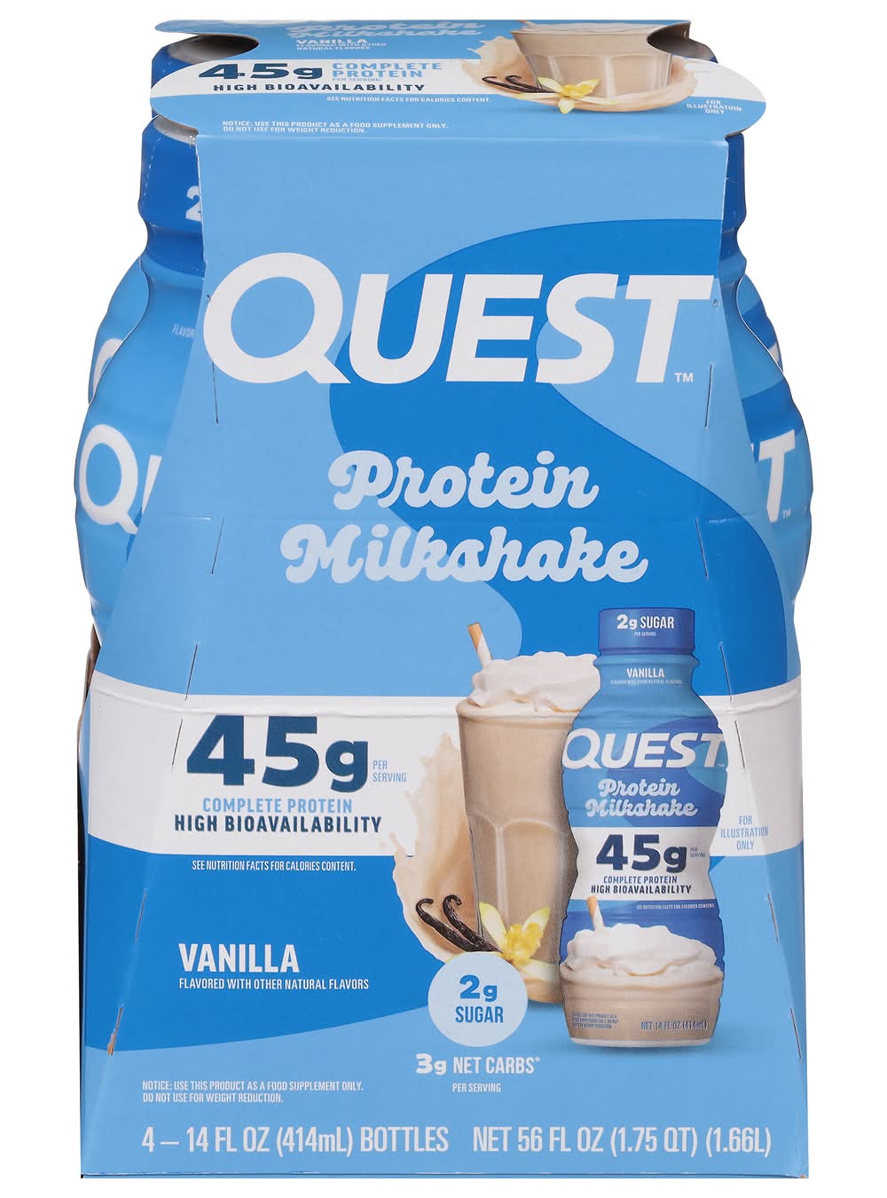 Quest - Protein Milkshake RTD - Vanilla • 45g Complete Protein • 3g Net Carbs • 2g Sugar • Gluten Free • 4 - 14fl oz Bottles • Flavor: Vanilla • Pack size: 4 • Size: 1 • Packaging: Reusable