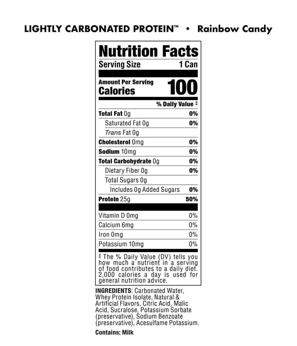 Ingredients: CARBONATED WATER, WHEY PROTEIN ISOLATE, NATURAL & ARTIFICIAL FLAVORS, CITRIC ACID, MALIC ACID, SUCRALOSE, POTASSIUM SORBATE (PRESERVATIVE), SODIUM BENZOATE (PRESERVATIVE), ACESULFAME POTASSIUM