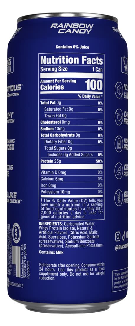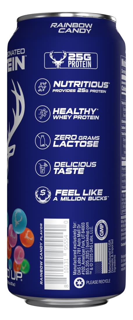 Bucked Up - Lightly Carbonated Protein - Rainbow Candy - 12 Cans • Nutritious* Provides 25g Protein • Healthy* Whey Protein • Zero Lactose • Delicious Taste • No Sugar & No Fat • Caffeine Free • Clear & Refreshing • Gluten Free • Flavor: Rainbow candy • Pack size: 12 • Size: 1