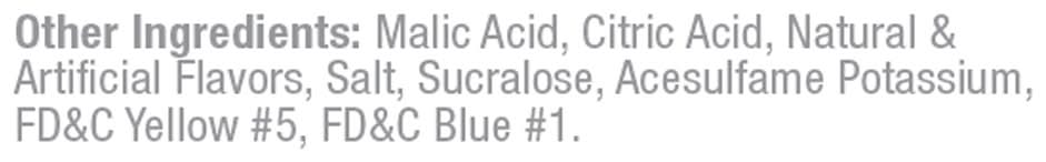 Ingredients: Other Ingredients: Malic Acid, Citric Acid, Natural & Artificial Flavors, Salt, Sucralose, Acesulfame Potassium, FD&C Yellow #5, FD&C Blue #1