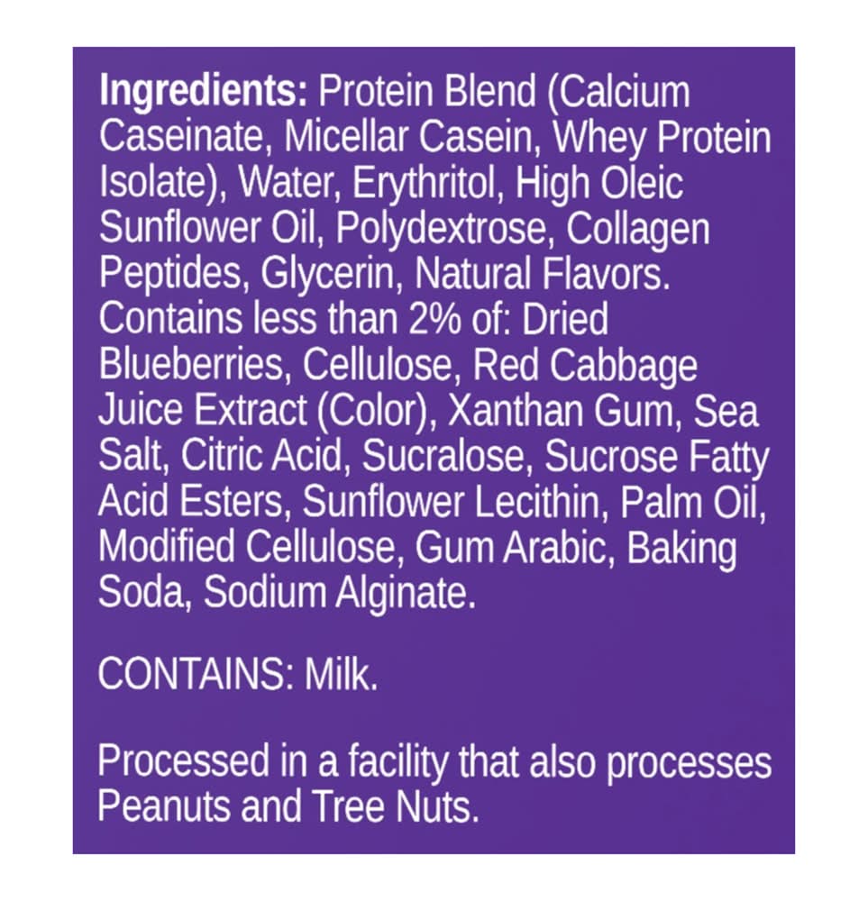 Ingredients: Protein Blend (Calcium Caseinate, Micellar Casein, Whey Protein Isolate), Water, Erythritol, High Oleic Sunflower Oil, Polydextrose, Collagen Peptides, Glycerin, Natural Flavors, Contains Less than 2% of: Dried Blueberries, Cellulose, Red Cabbage Juice Extract (Color), Xanthan Gum, Sea Salt, Citric Acid, Sucralose, Sucrose Fatty Acid Esters, Sunflower Lecithin, Palm Oil, Modified Cellulose, Gum Arabic, Baking Soda, Sodium Alginate Contains: Milk, Peanuts, Tree Nuts