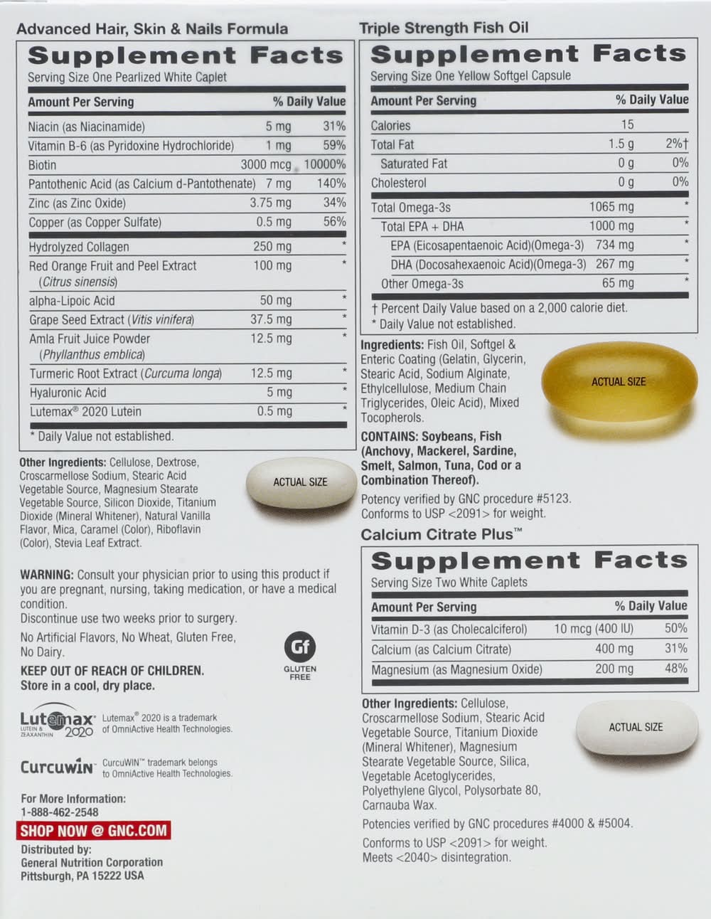 Ingredients: Women's Ultra Mega without Iron: Super Antioxidant Blend: Alpha-Lipoic Acid, Lutemax 2020 Lutein, Lycopene, Turmeric Root Extract (CurcuWin) (Curcuma Longa) (Standardized to Curcuminoids), Zeaxanthin (as Zeaxanthin Isomers), Astaxanthin (from Haematococcus Pluvialis), Beta-Cryptoxanthin. Fruit & Vegetable Blend: Orange Peel Powder, Spinach Leaf Powder, Elderberry Fruit Powder, Acai Fruit Powder, Blueberry Pomace Powder, Cranberry Fruit Powder, Pomegranate Fruit Powder, Broccoli Powder, Tomato Powder, Grape Skin Powder, Carrot Powder, Papaya Fruit Powder, Pineapple Fruit Powder, Cauliflower Powder, Kale Leaf Powder, Apple Fruit Powder, Kiwi Fruit Powder. Beauty Blend: Green Tea Leaf Extract (Camellia Sinensis)(Standardized to Polyphenols), Silica (as Silicon Dioxide), Hyaluronic Acid (as Sodium Hyaluronate), Grape Seed Extract (Vitis Vinifera) (Standardized to Polyphenols). Brain Health Blend: Inositol, Boron (as Sodium Borate), Vanadium (as Sodium Metavanadate). Other Ingredients: Cellulose, Stearic Acid Vegetable Source, Magnesium Stearate Vegetable Source, Titanium Dioxide (Mineral Whitener), Talc, Natural Vanilla Mint Flavor, Chlorophyll (Color), Stevia Leaf Extract. Cranberry Fruit: Other Ingredients: Gelatin, Stearic Acid Vegetable Source, Corn Starch, Magnesium Stearate Vegetable Source. Dicalcium Phosphate, Cellulose, Silicon Dioxide. Advanced Hair, Skin & Nails Formula: Other Ingredients: Cellulose, Dextrose, Croscarmellose Sodium, Stearic Acid Vegetable Source, Magnesium Stearate Vegetable Source, Silicon Dioxide, Titanium Dioxide (Mineral Whitener), Natural Vanilla Flavor, Mica, Caramel (Color), Riboflavin (Color), Stevia Leaf Extract. Triple Strength Fish Oil: Fish Oil, Softgel & Enteric Coating (Gelatin, Glycerin, Stearic Acid, Sodium Alginate, Ethylcellulose, Medium Chain Triglycerides, Oleic Acid), Mixed Tocopherols. Calcium Citrate Plus: Other Ingredients: Cellulose, Croscarmellose Sodium, Stearic Acid Vegetable Source, Titanium Dioxide (Mineral Whitener), Magnesium Stearate Vegetable Source, Silica, Vegetable Acetoglycerides, Polyethylene Glycol, Polysorbate 80, Carnauba Wax Contains: 'Contains Fish', 'Contains Soybeans'